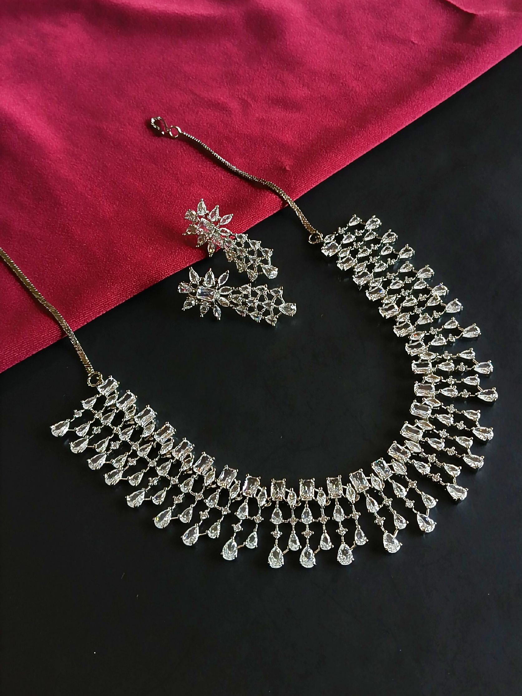 Beautifully crafted necklace made with high-quality brass, premium polish, and high-finish plating. Studded with shiny American Diamonds for a rich, elegant sparkle that enhances any festive look.