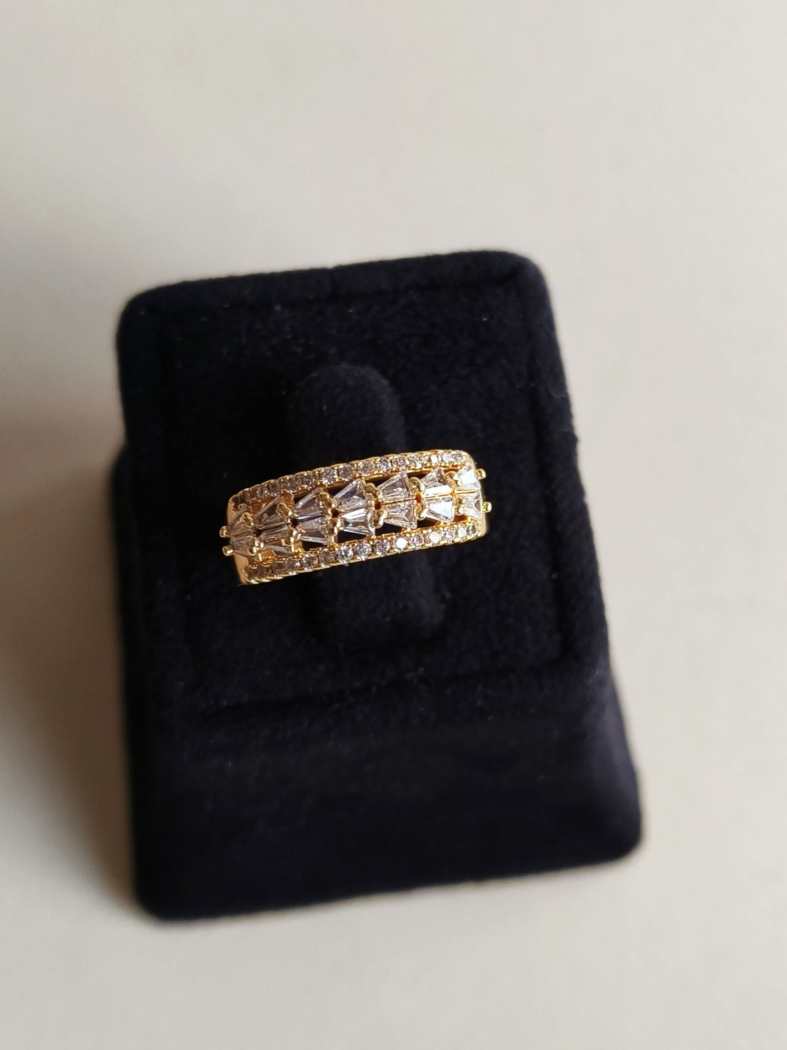 Beautifully crafted adjustable finger ring made with high-quality brass, premium polish, and high-finish plating. Studded with shiny American Diamonds for an elegant sparkle. The adjustable design comfortably fits most finger sizes.