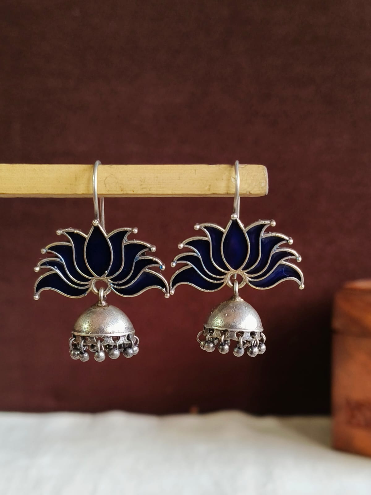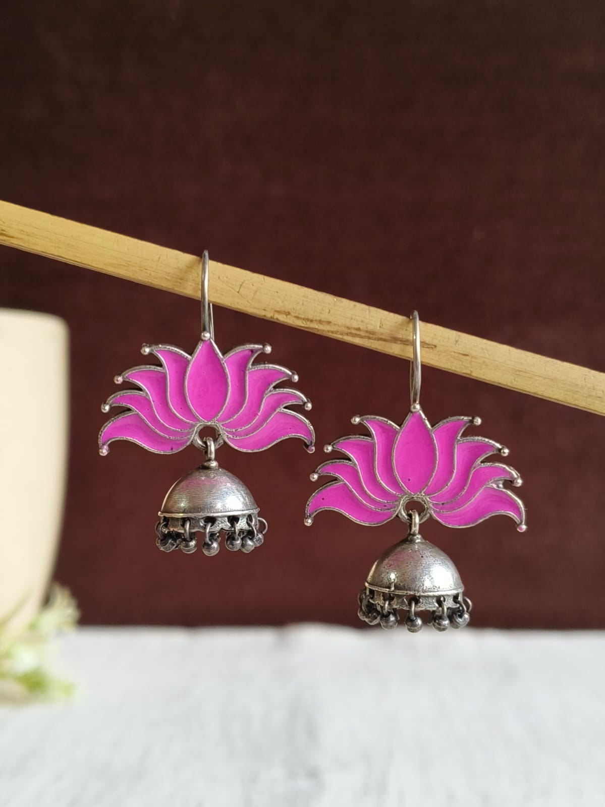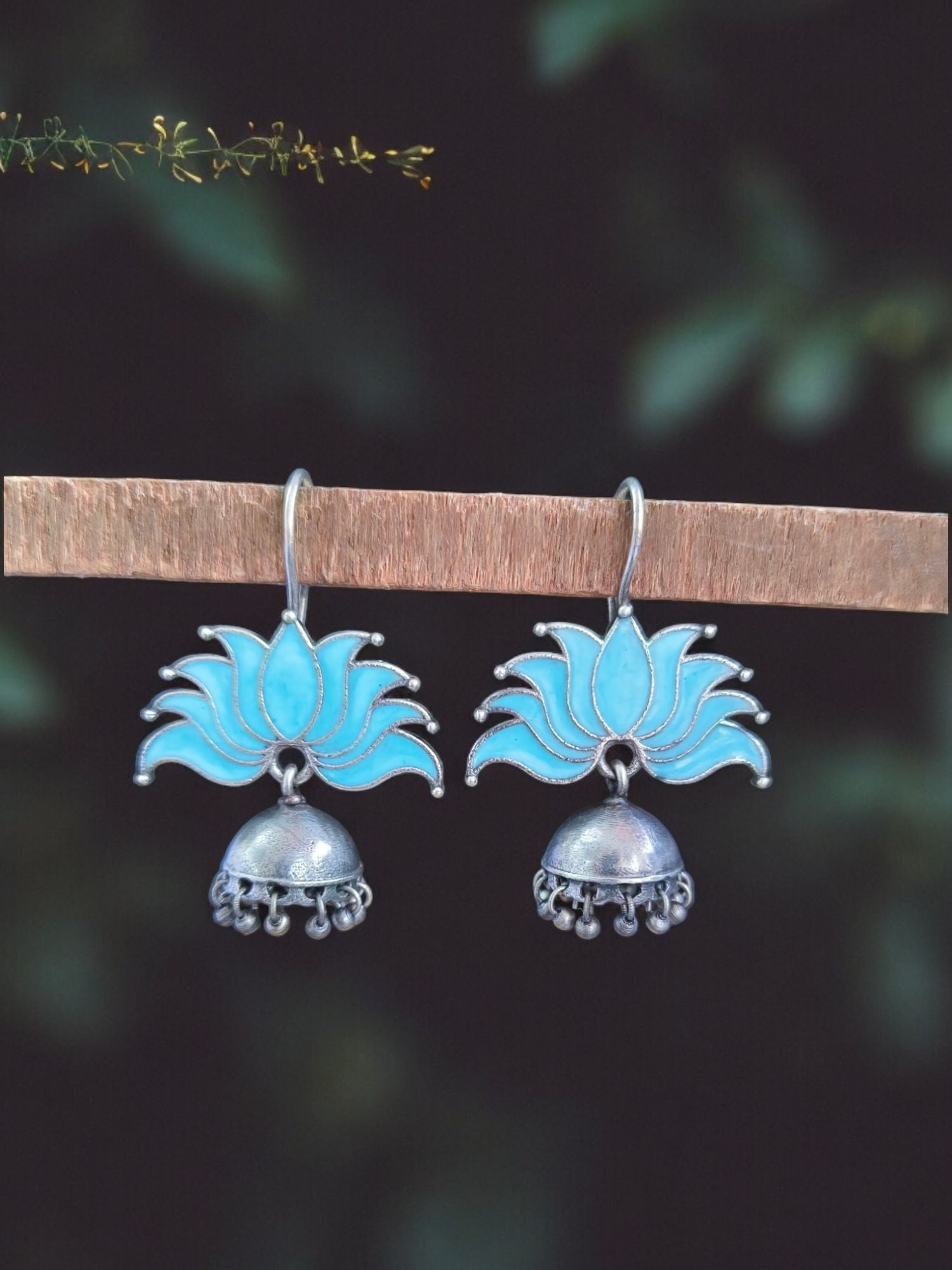 Add some flair to your jewelry collection by wearing the Lotus oxidized Jhumka Earrings designed and meticulously made using brass and enamel. They are timeless in their elegance and class, which makes them an ideal accessory to complement both modern and traditional styles. They are beautiful peacocks with sophisticated design and an oxidized look making them perfect for every occasion from weddings to celebrations.