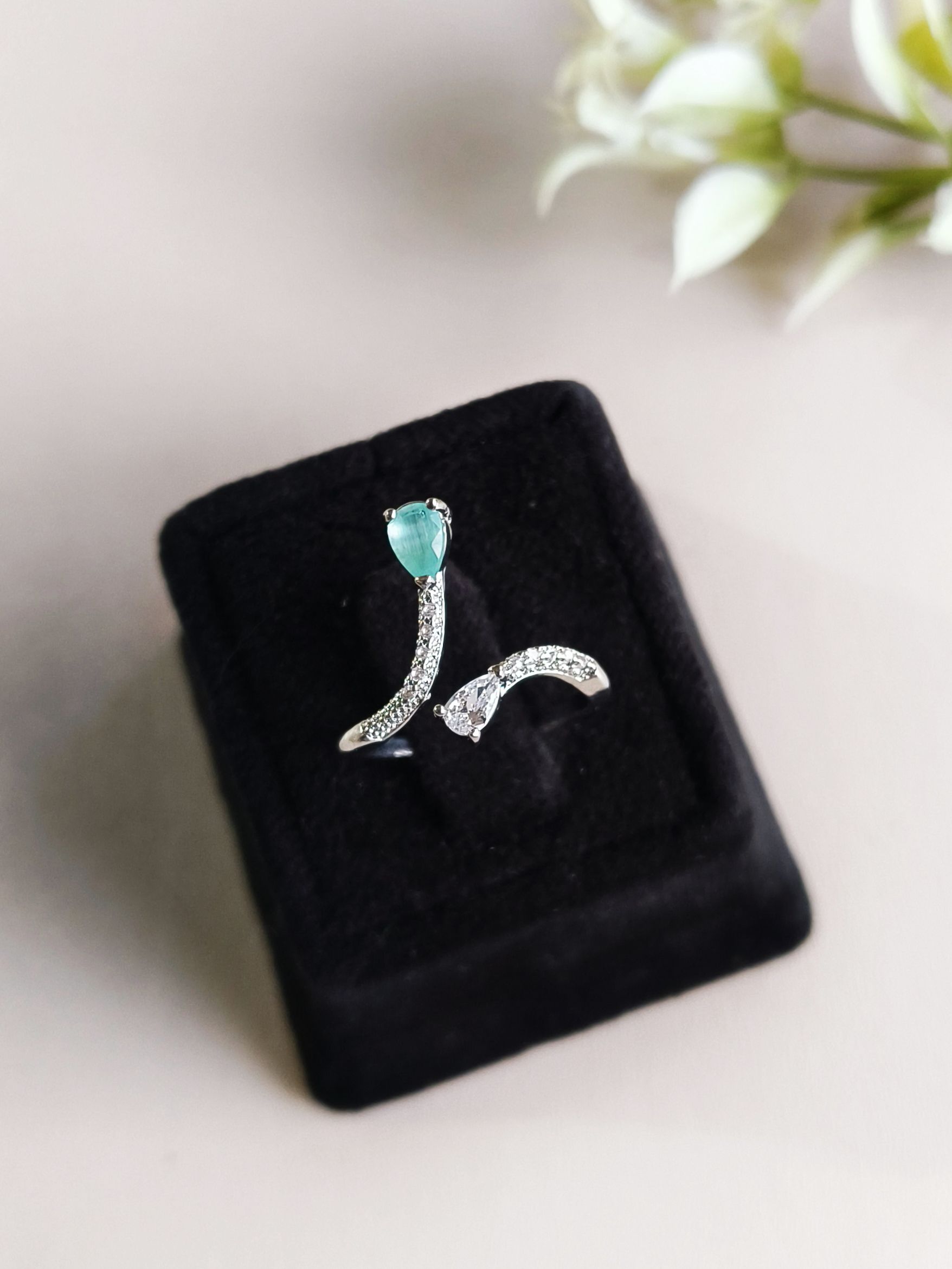Beautifully crafted adjustable finger ring made with high-quality brass, premium polish, and high-finish plating. Studded with shiny American Diamonds for an elegant sparkle. The adjustable design comfortably fits most finger sizes.