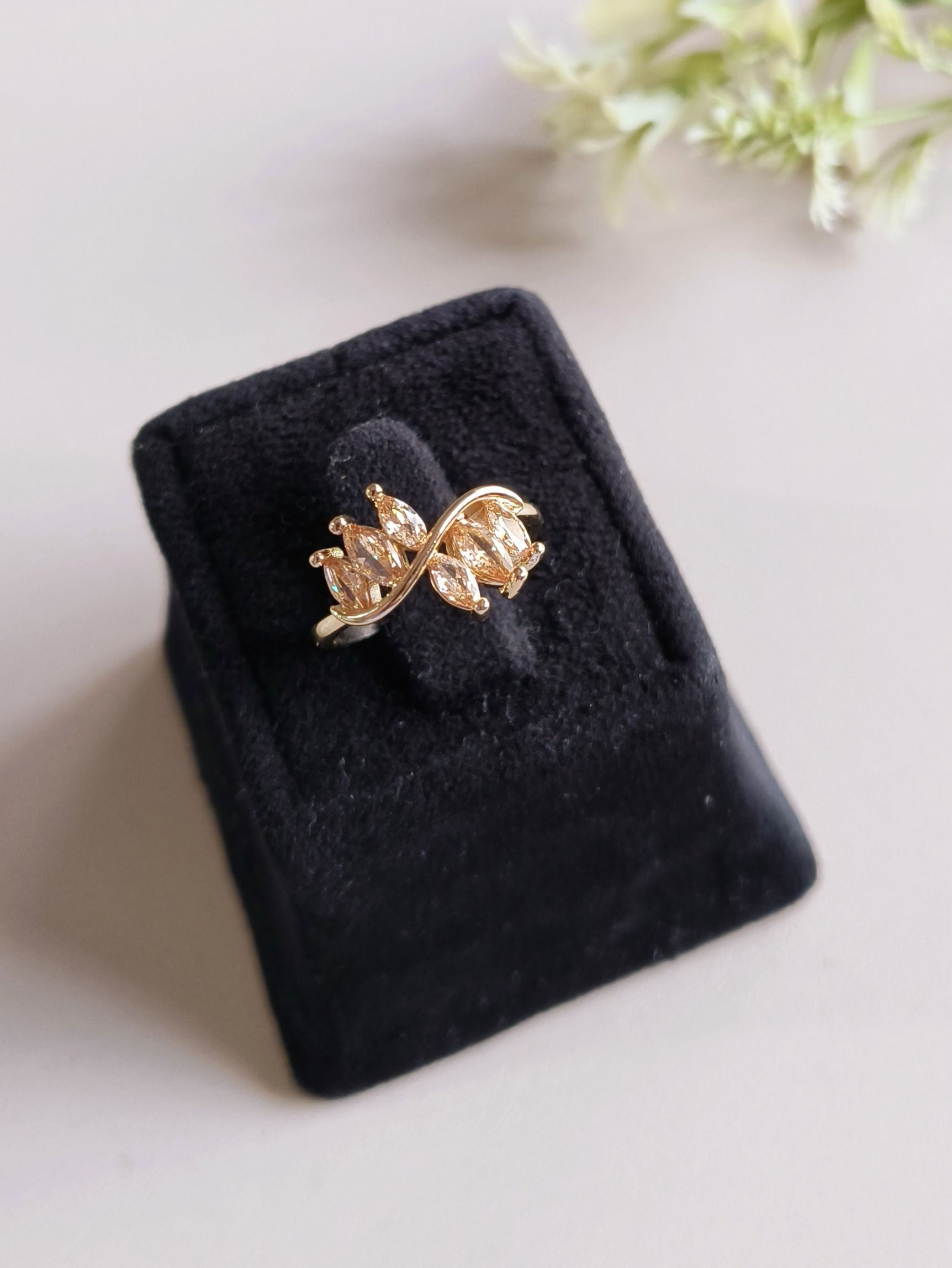 Beautifully crafted adjustable finger ring made with high-quality brass, premium polish, and high-finish plating. Studded with shiny American Diamonds for an elegant sparkle. The adjustable design comfortably fits most finger sizes.