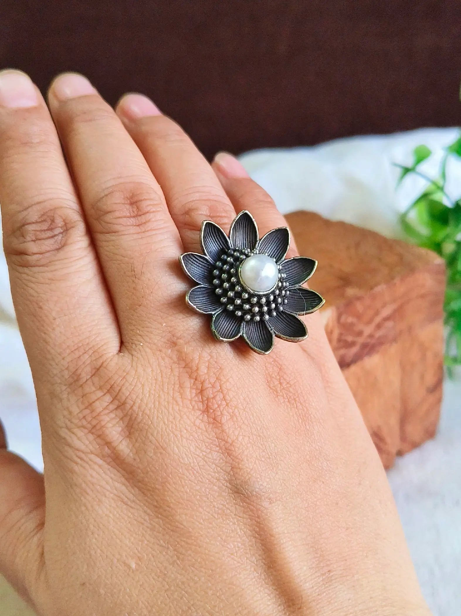 Add a touch of vintage elegance to your look with this Antique Silver Plated Oxidised Adjustable Flower Design Ring from Sarichka. Designed with a detailed floral motif, this statement piece carries an old-world charm blended with modern versatility. Its adjustable band ensures a comfortable fit for all.