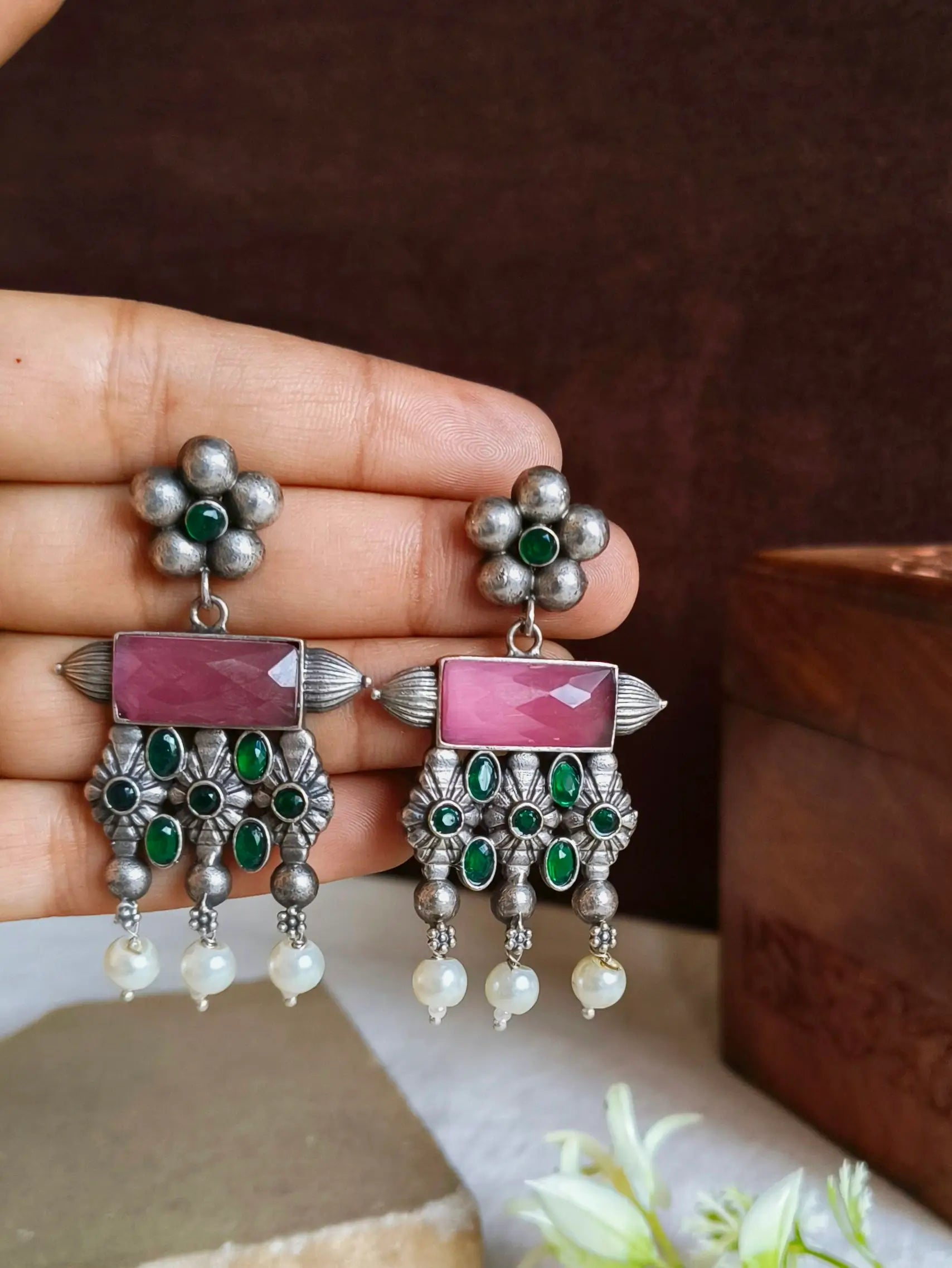 Enhance your look by wearing our antique Oxidised Meenakari Earrings. A striking blend of traditional and class. The exquisite earrings are made of high-end brass, with exquisite silver plating. They are created to add a hint timeless elegance to any style. The exquisite Meenakari piece showcases vivid enamels that are hand-painted to bring a pop of elegance and color.