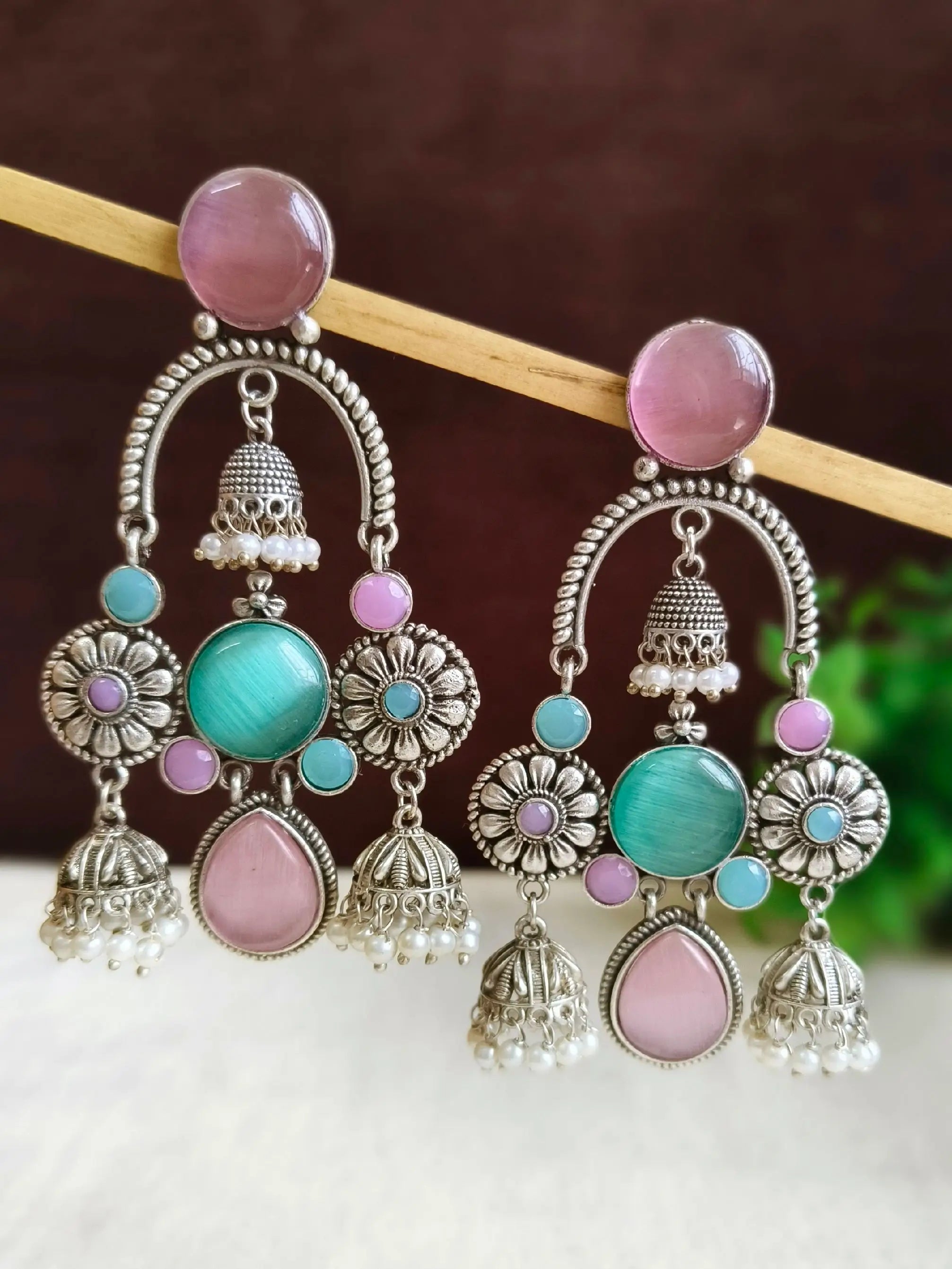 Celebrate the festive spirit with these traditional antique silver look-alike jhumka earrings from Sarichka Fashion. Crafted in an oxidized silver finish, these earrings feature intricate floral engravings and playful ghungroo accents that add rhythmic charm to every step. A must-have for Garba nights, Navratri, and other cultural festivities, these jhumkas combine heritage with festive flair.