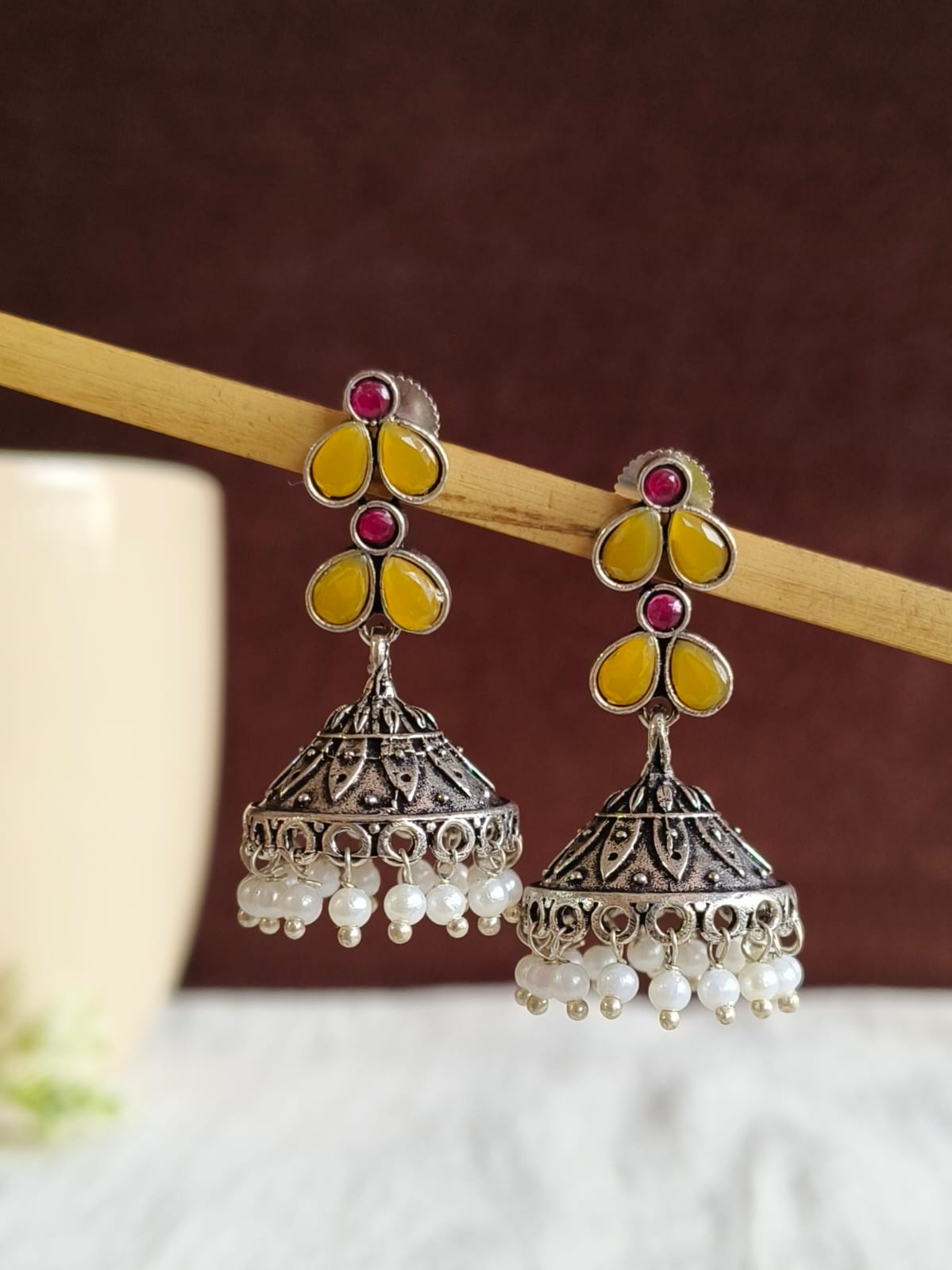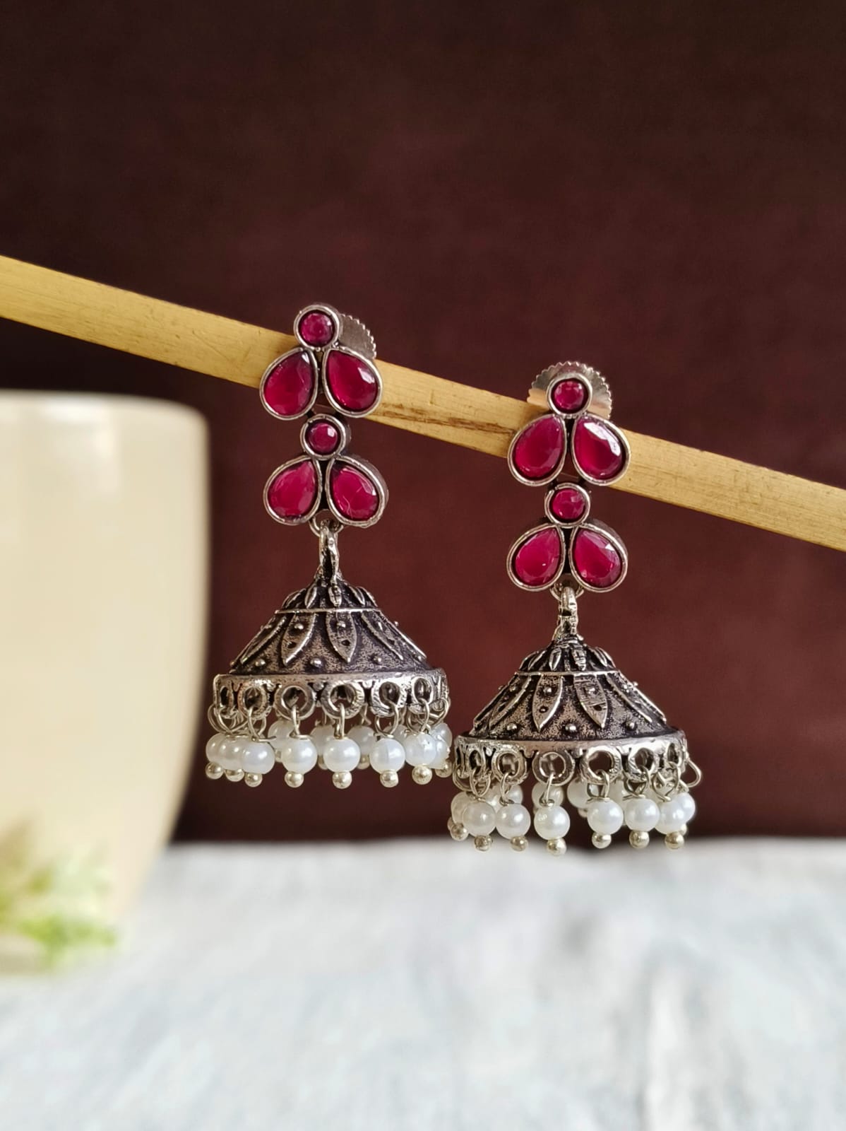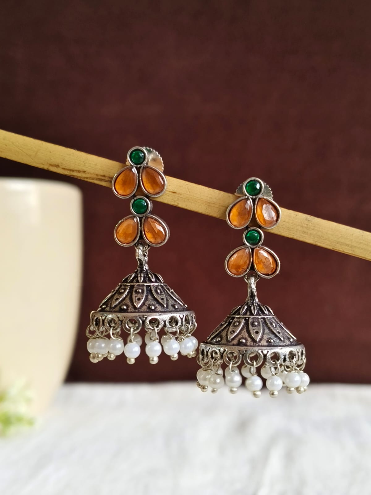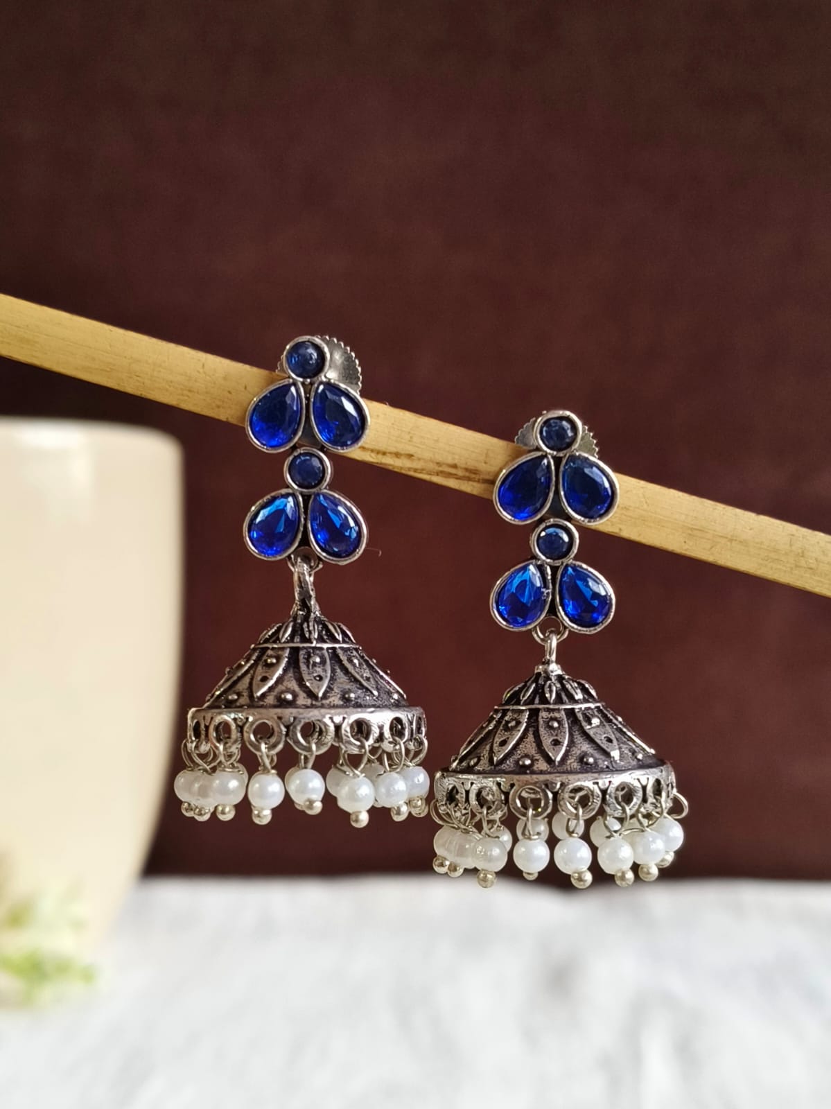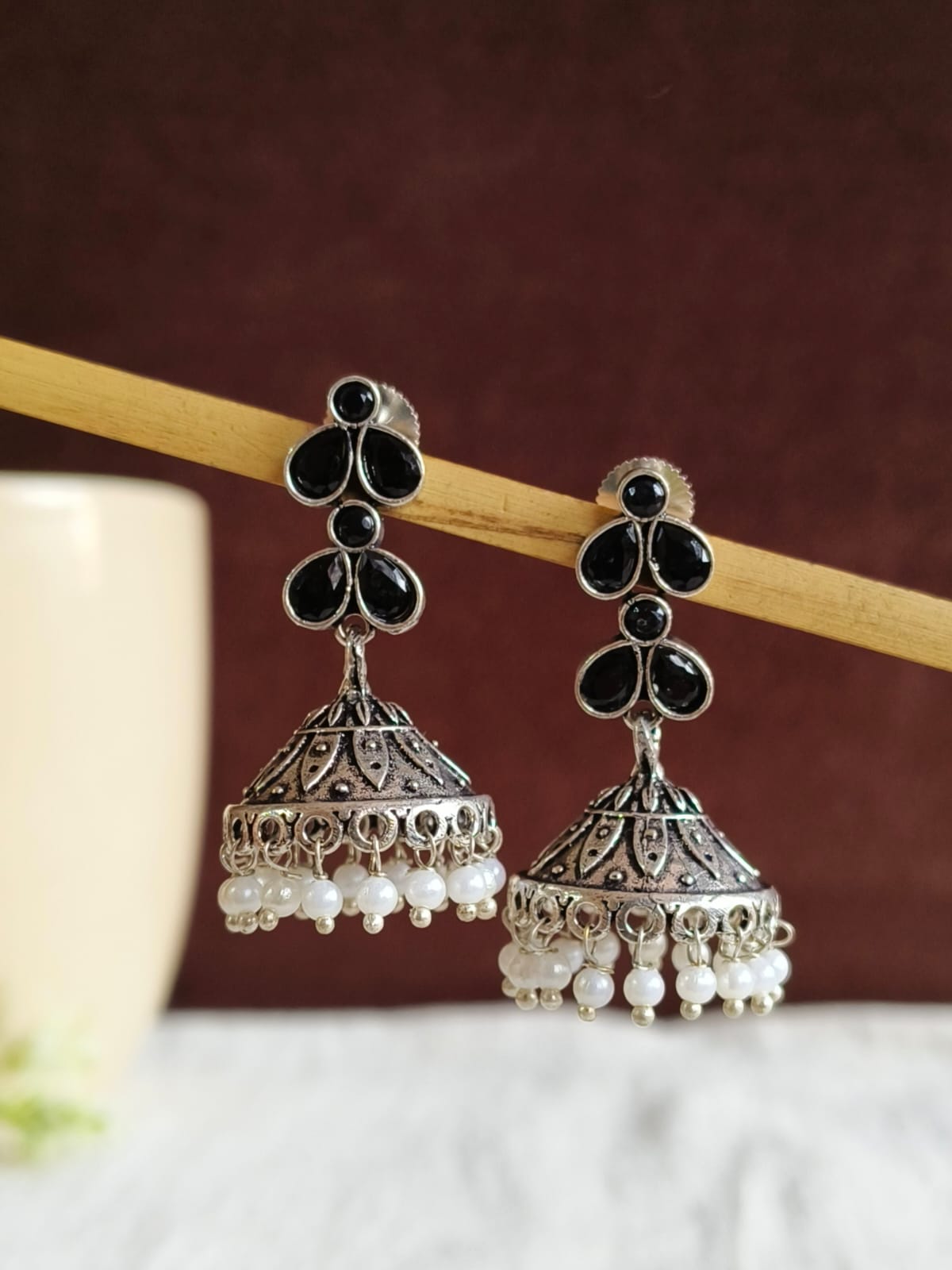 For keeping your black oxidised jhumka in top condition and gleaming, clean it with a soft towel and keep them away from harmful chemicals. Keep the earrings in a dry area to keep them from rusting and then remove they are removed prior to swimming or showering.