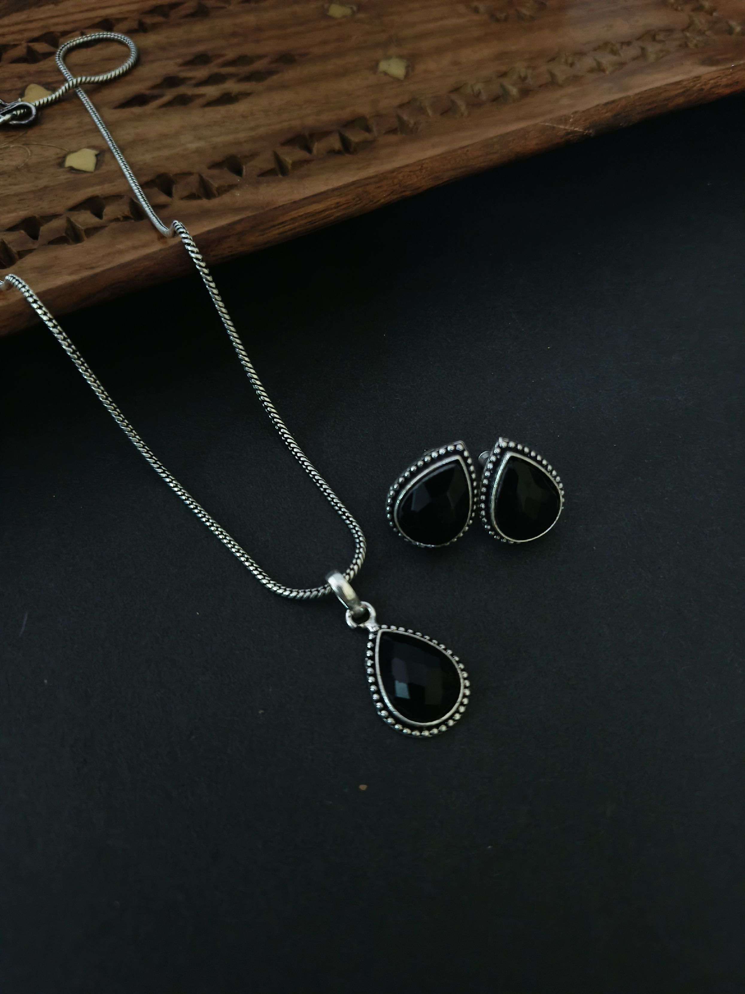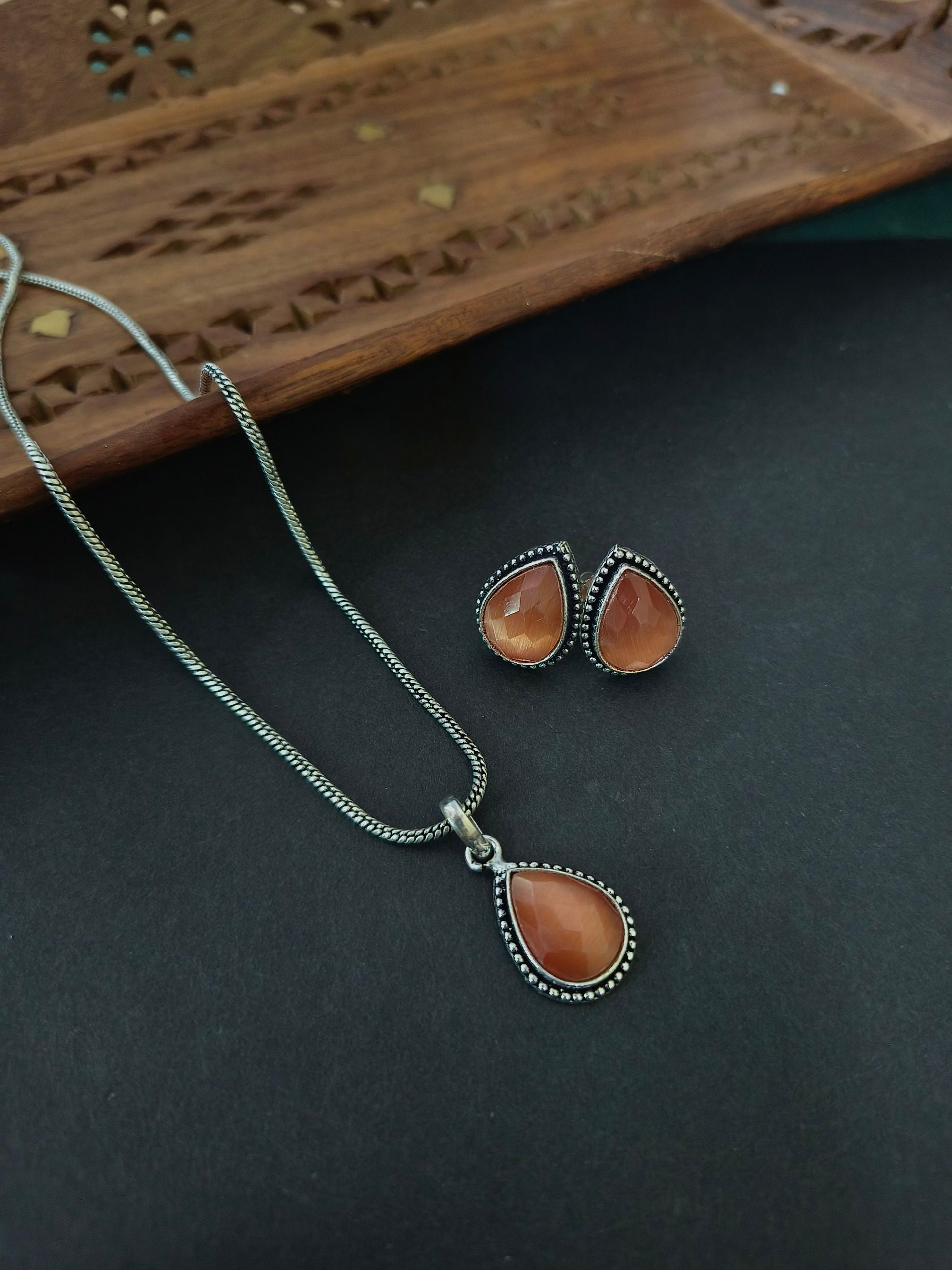 • Design Elements: Elegant teardrop stone detailing in matching necklace and earrings