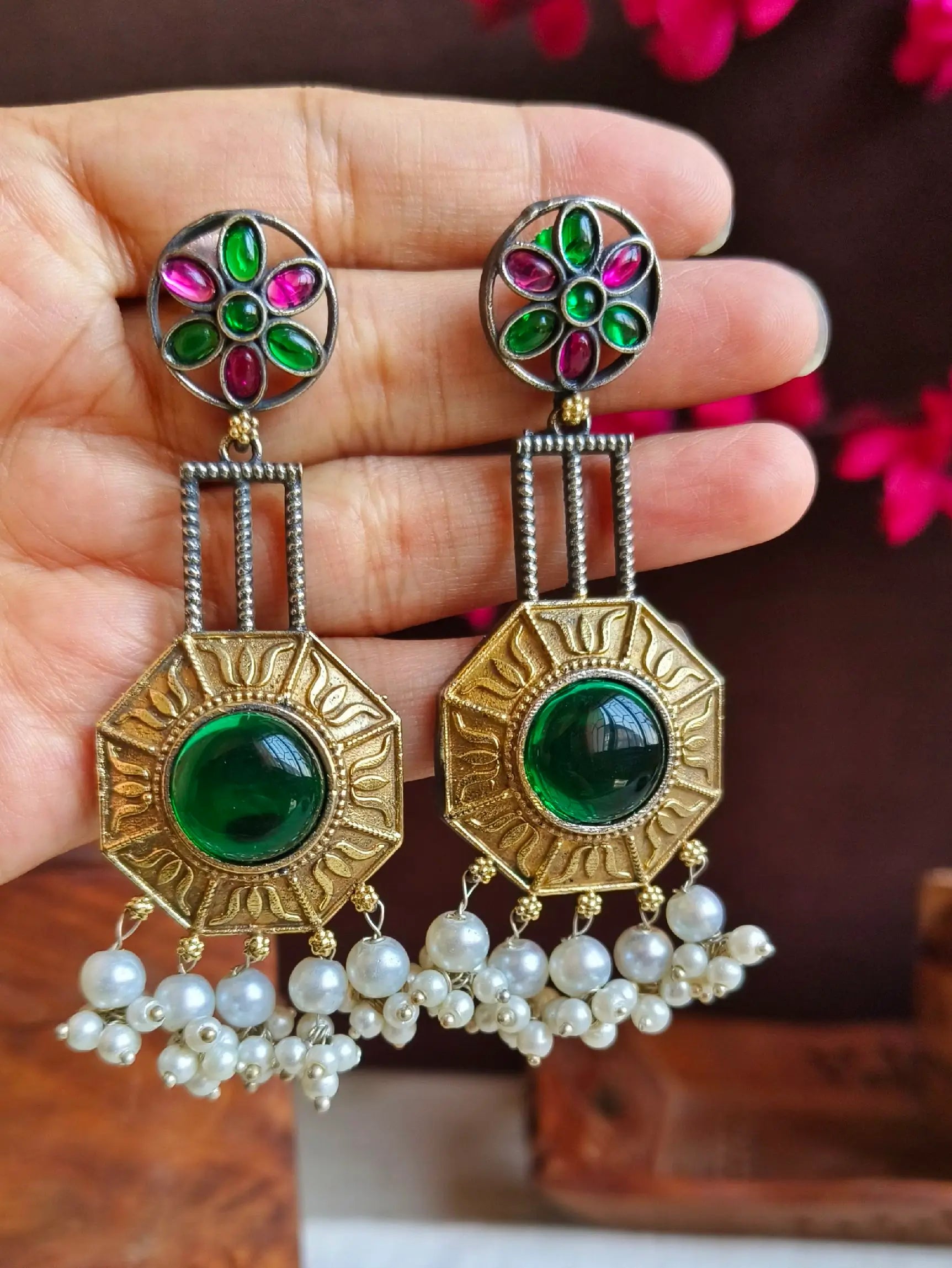 Step into elegance with Sarichka’s dual-tone dangler earrings, showcasing expert craftsmanship and a timeless finish. The beautiful fusion of golden and silver polish offers a rich, vintage vibe that’s both versatile and eye-catching.
