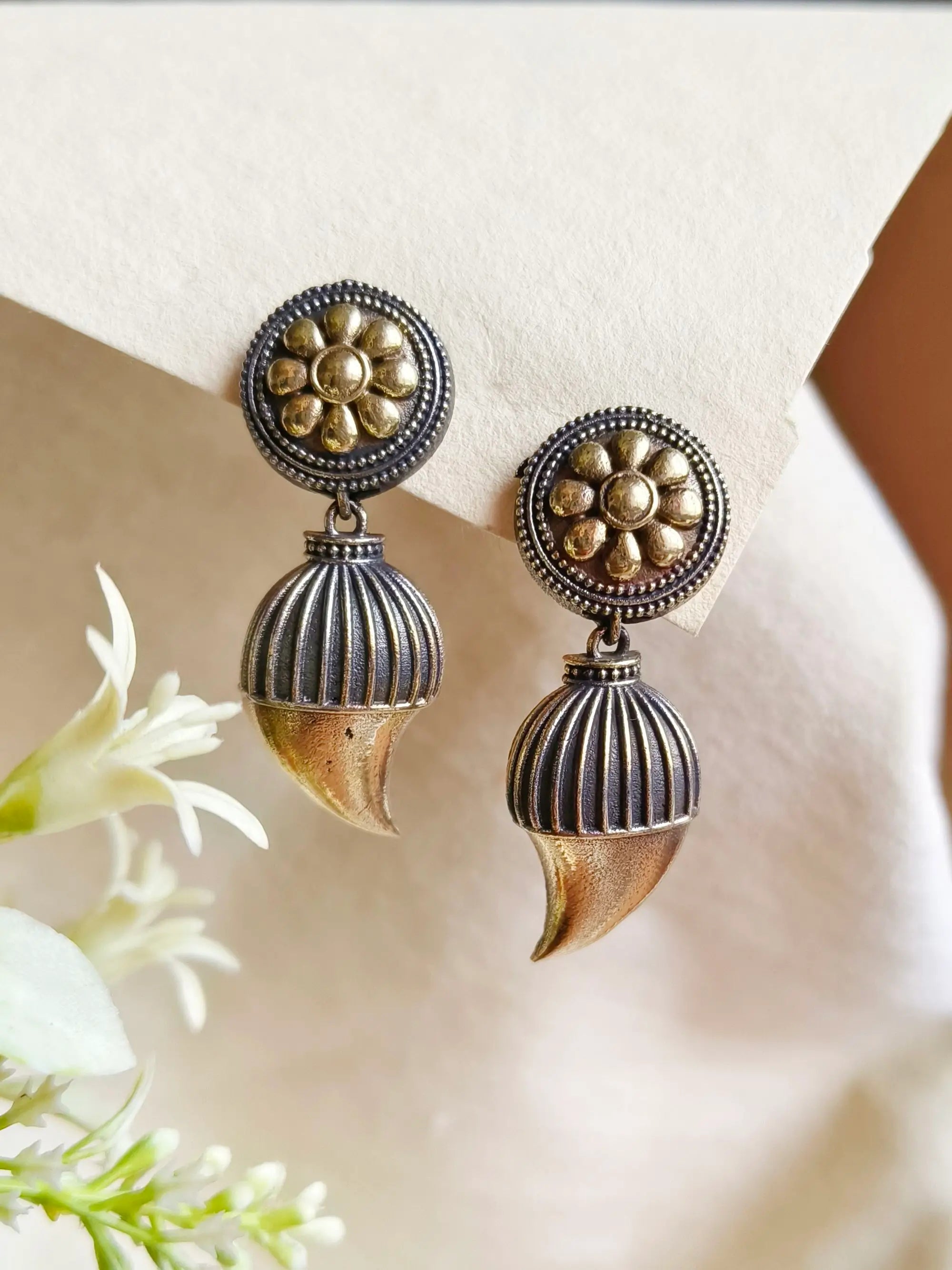 Enhance your ethnic elegance with these dual-tone antique keri dangler earrings. Designed for timeless appeal, they bring sophistication to any look.