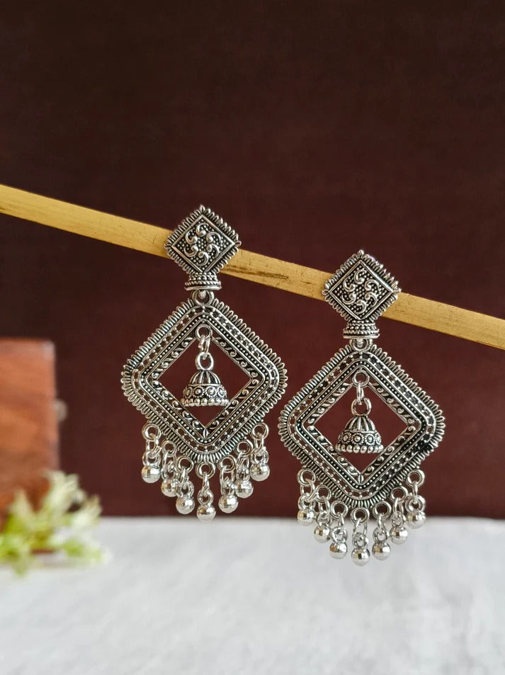 Elevate your ethnic style with these oxidized silver square jhumka earrings featuring delicate ghungroos. The unique square top design combined with traditional jhumka bells creates a perfect blend of modern geometry and classic charm.