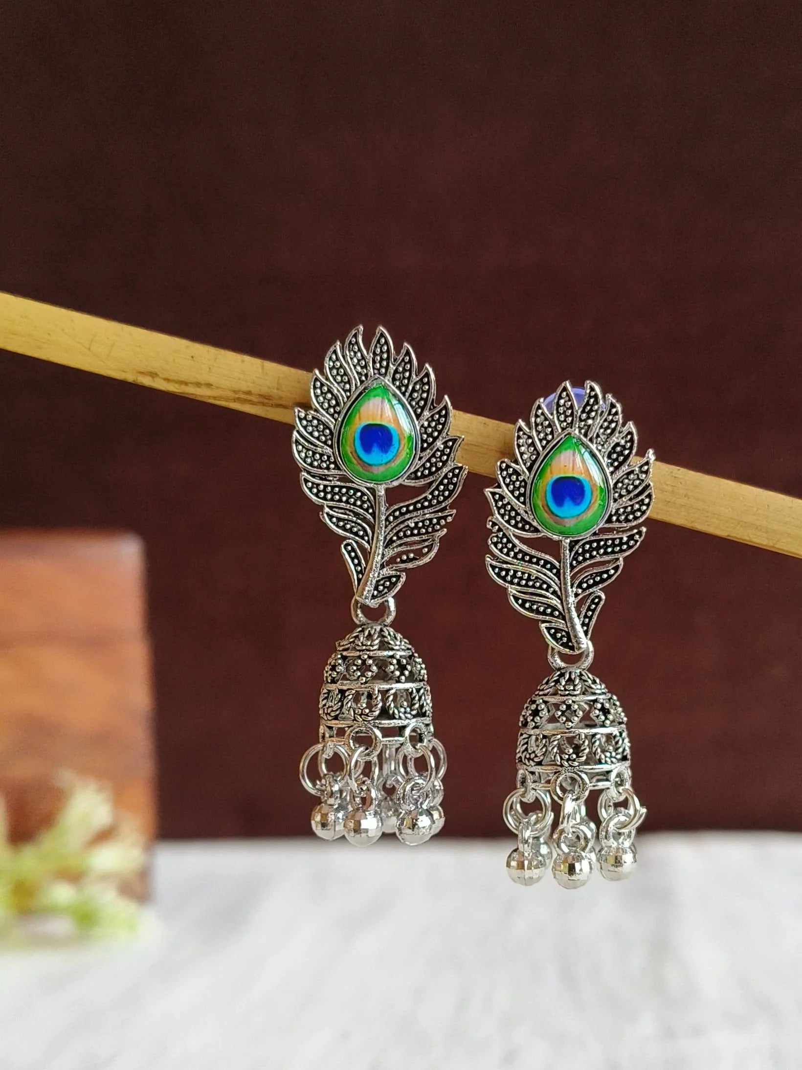 Add a touch of royal elegance with these ethnic peacock feather jhumka earrings, inspired by traditional artistry and graceful design.