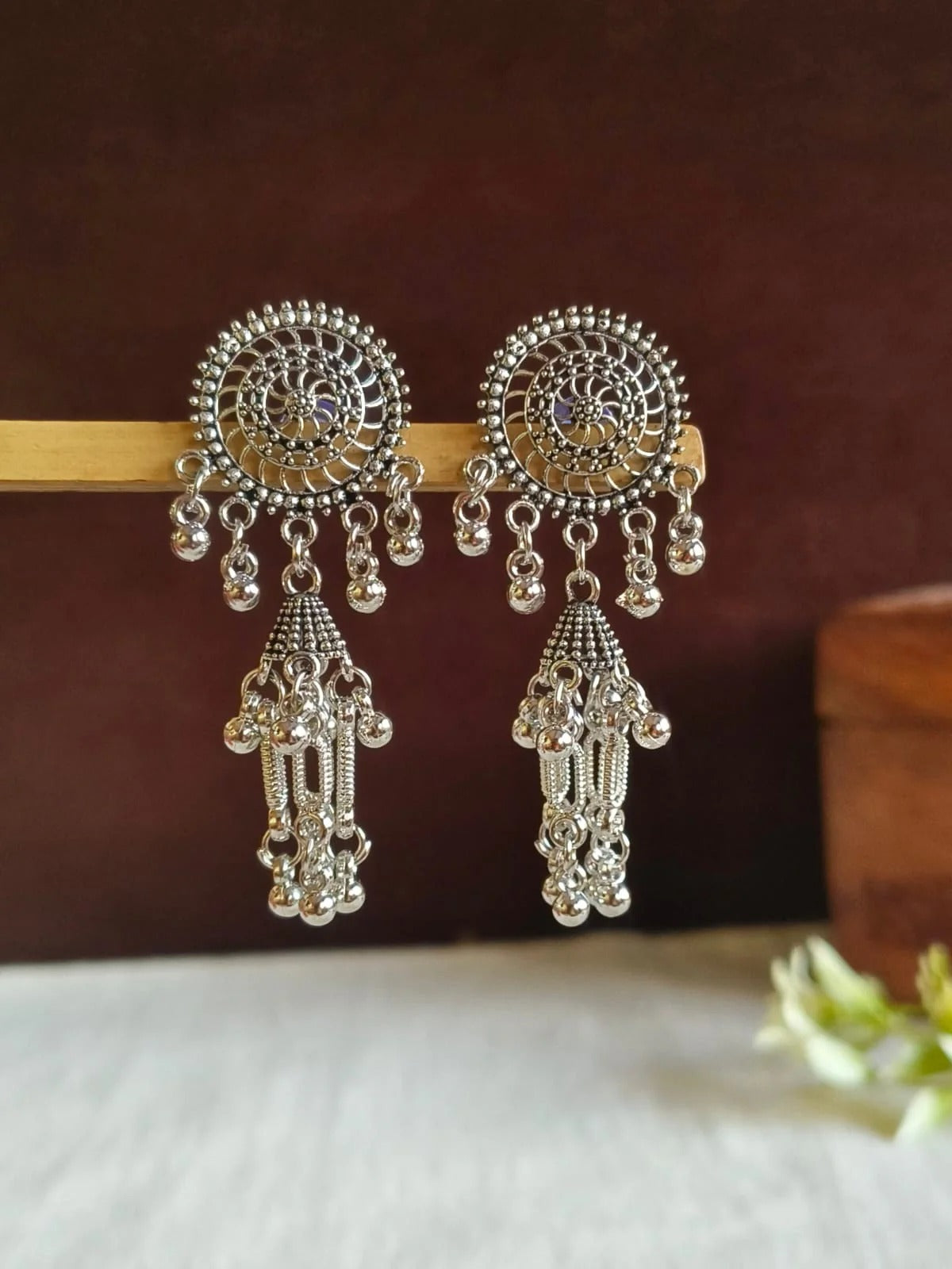 Add a graceful charm to your look with these oxidized silver floral chain dangler jhumka earrings, designed to blend traditional elegance with a stylish twist.