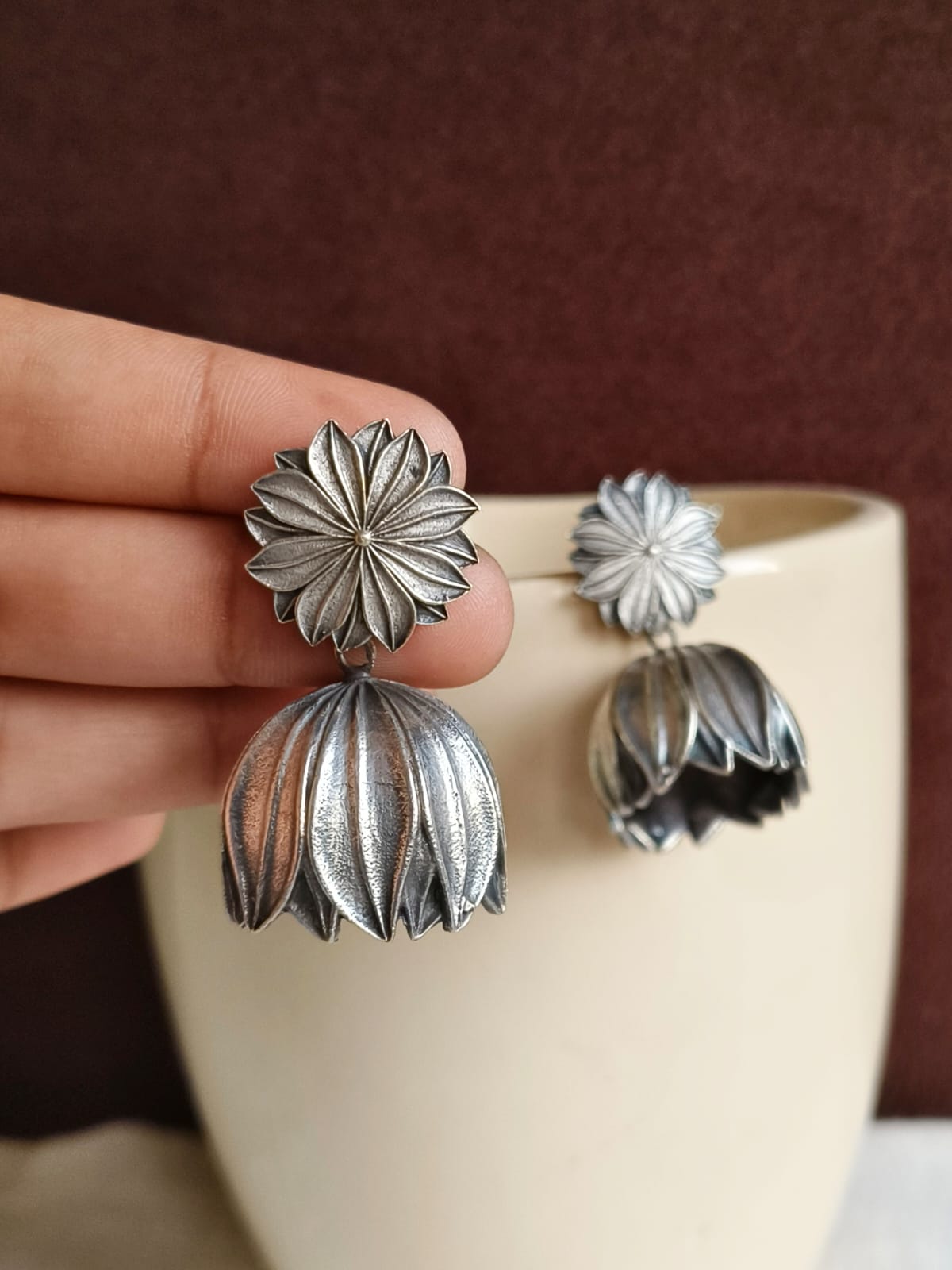 Explore the stunning elegance of our floral Oxidized Lotus Jhumka Earrings, created to add a dash of traditional and style to your jewelry collection. They are expertly made from top-quality brass that is finished with sterling silver plating that is 925 in premium quality to ensure the durability of these earrings and giving them a classy design.