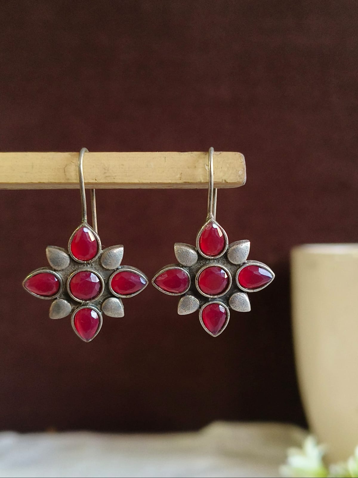 Improve your style by putting on our Floral Replica Stone oxidized hook earring. Made with precision from sturdy brass, and featuring sleek sterling silver plating. These earrings were created to be a standout. The intricately oxidized details with striking stones make for a stylish style that effortlessly blends modern fashion with old-fashioned charm.
