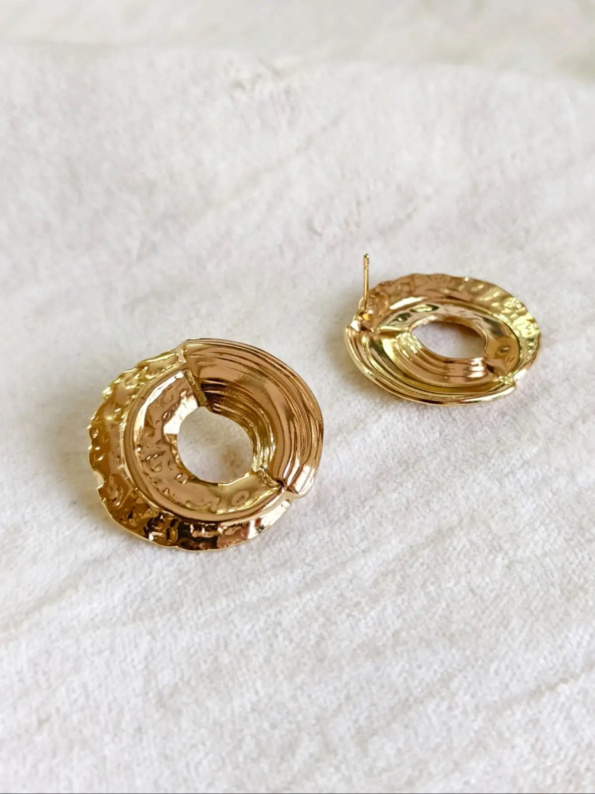 Add a bold touch of modern elegance with these Stainless Steel Pleated Hammered Texture Earrings, finished in a rich golden polish. Their irregular geometric round design creates a striking statement, perfect for elevating any look. Lightweight yet luxe, these earrings are ideal for party wear, office styling, casual outings, and special occasions. Their unique pleated detailing and hammered finish make them an excellent gift choice for those who love contemporary jewelry. Pair them effortlessly with western, fusion, or Indo-western outfits for a chic, fashion-forward appearance.
