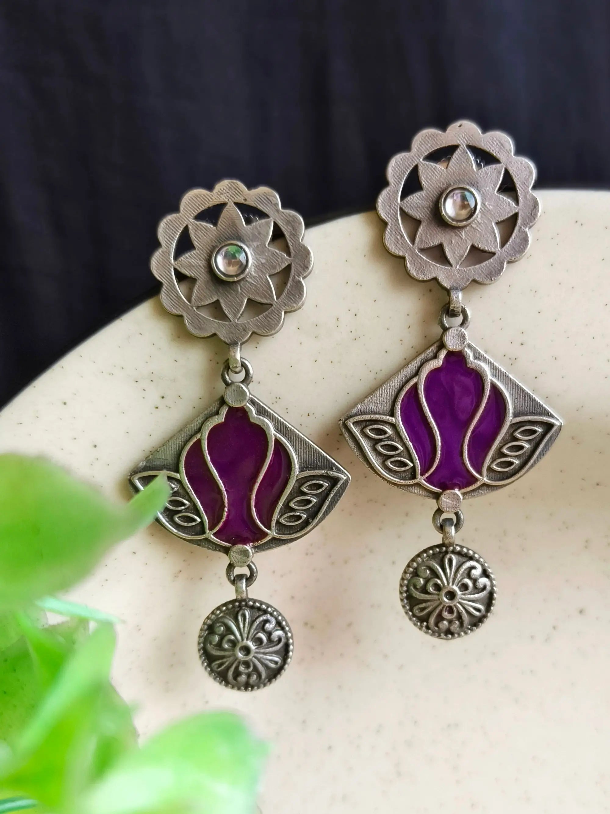 Add a touch of elegance with these hand-painted Meenakari silver dangler earrings, designed to enhance your festive and ethnic looks. Crafted with intricate detailing, they are perfect for making a bold statement.
