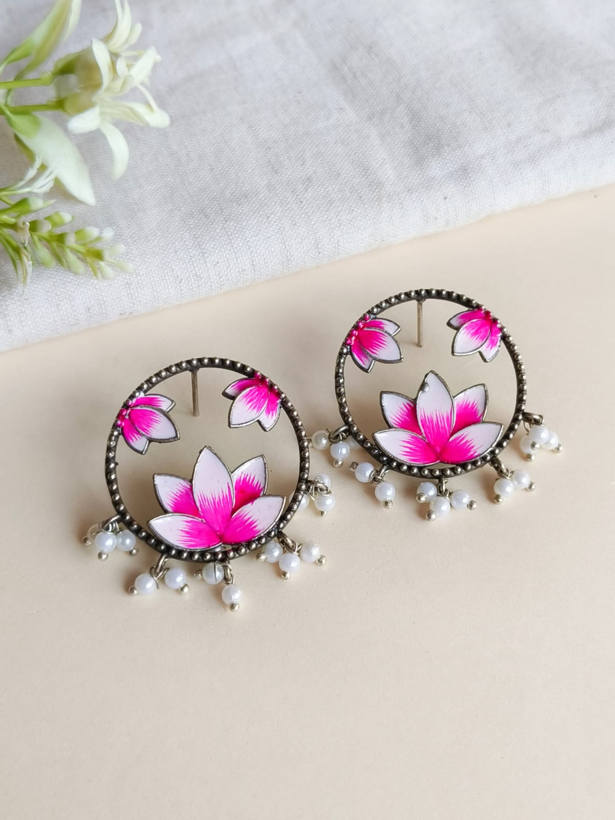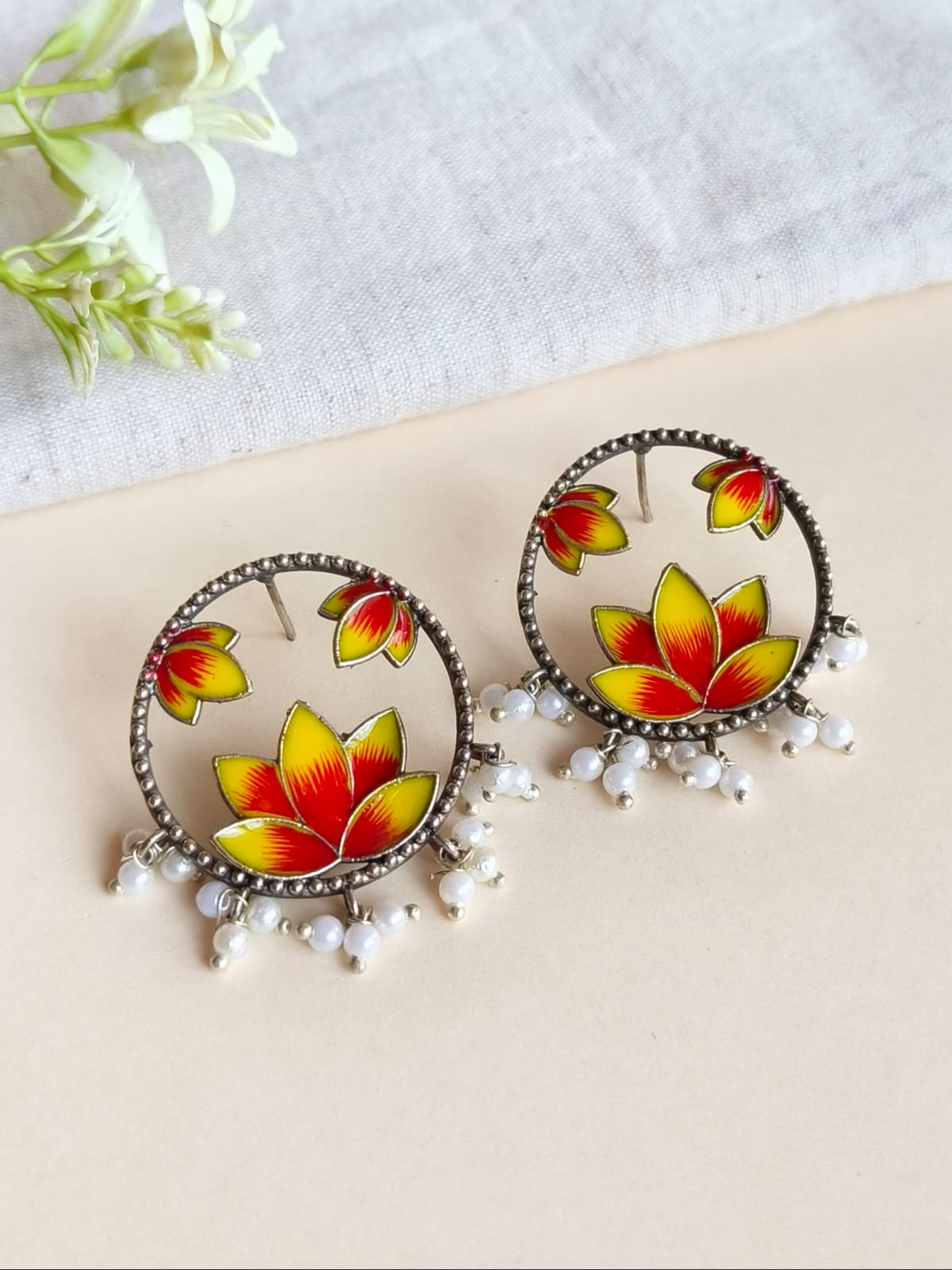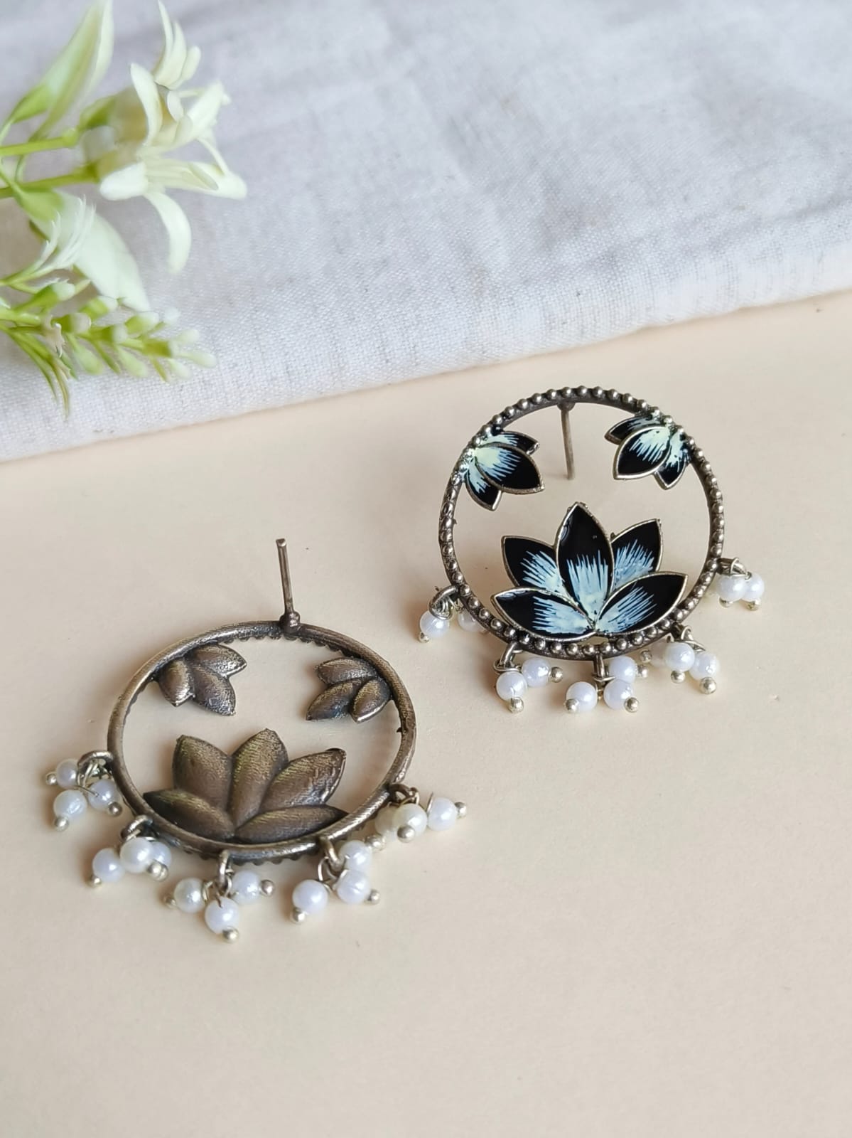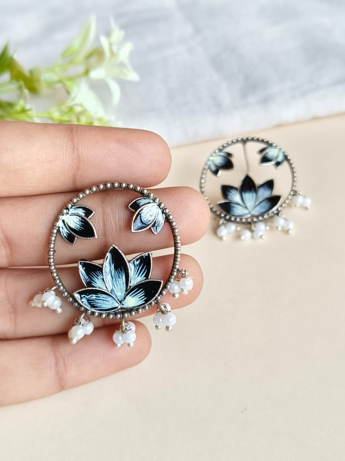 Enhance your everyday elegance with these premium quality oxidized silver handpainted flower stud earrings. Designed with intricate floral artistry and an antique oxidized finish, these studs bring together traditional craftsmanship and modern sophistication.