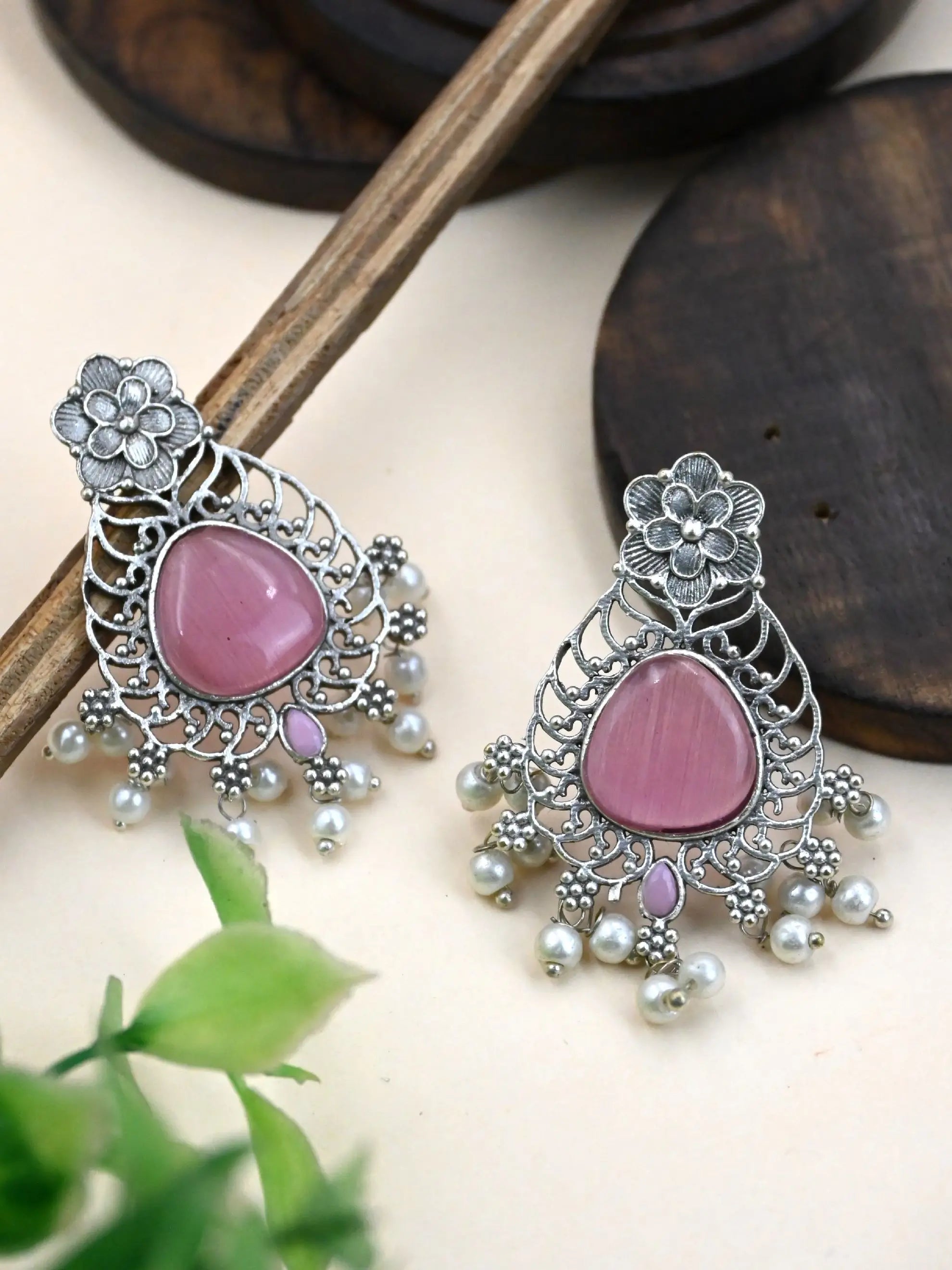 Add an exquisite touch to your ethnic wardrobe with these silver-plated oxidized stud earrings from Sarichka. Featuring intricate Monalisa stones and delicate pearl accents, these earrings perfectly complement traditional and festive attire.