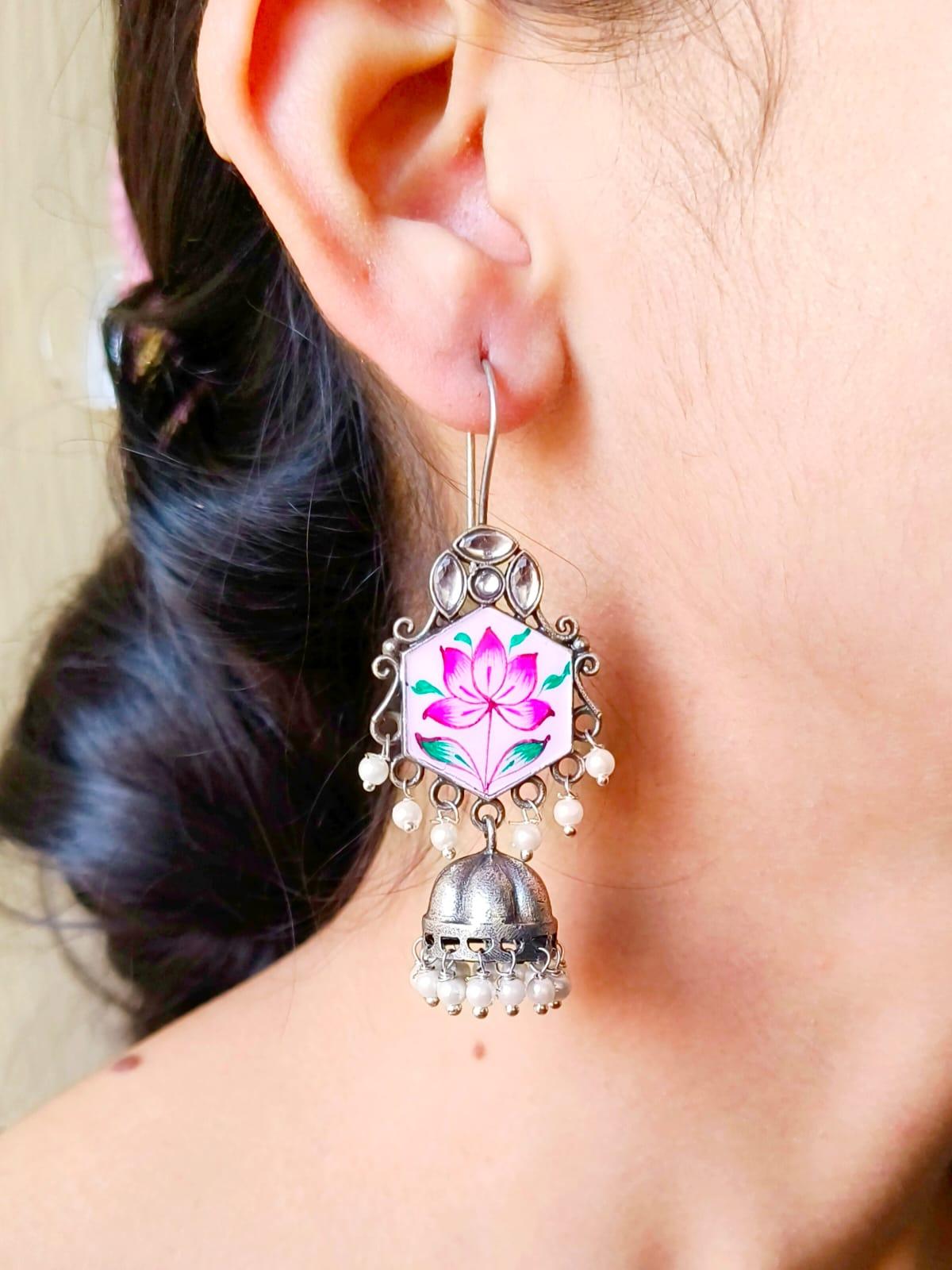 The hand-painted Jewelry are hand-painted with meticulous care which draw inspiration from classic artwork. The vivid colors and intricate designs pop beautifully against the silver oxidized base and create a stunning visual contrast that's both captivating and classy. If you're dressing for an event or adding some bright color to your regular outfit These earrings are guaranteed to stand out.