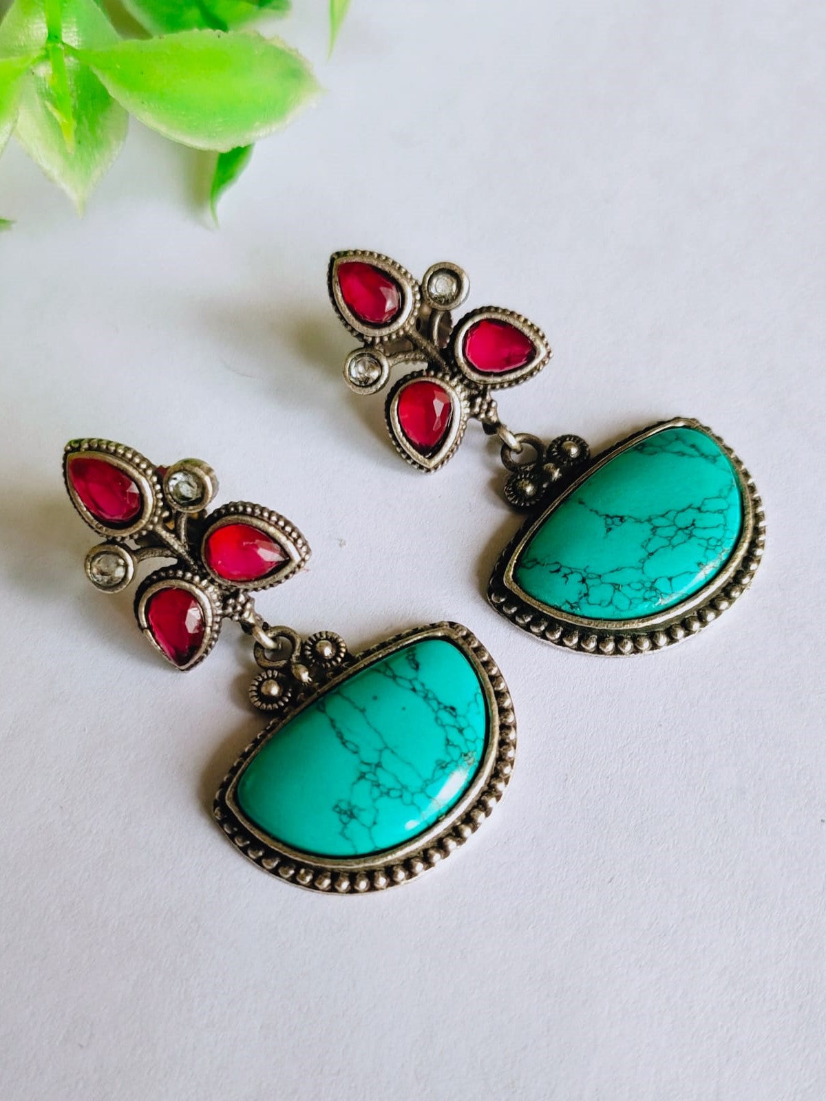 These oxidised silver look-alike stone D-shape dangler earrings are a perfect balance of elegance and sophistication. The beautifully designed earrings feature stone detailing that adds a touch of sparkle to your attire. Ideal for casual, office, or semi-formal occasions, they can be paired with both traditional and western outfits, offering ultimate versatility. These earrings make for an excellent gift choice, perfect for any special occasion. With Sarichka's latest collection, you can elevate your accessory game effortlessly. Shop now to grab the best deals and add these stunning danglers to your collection.