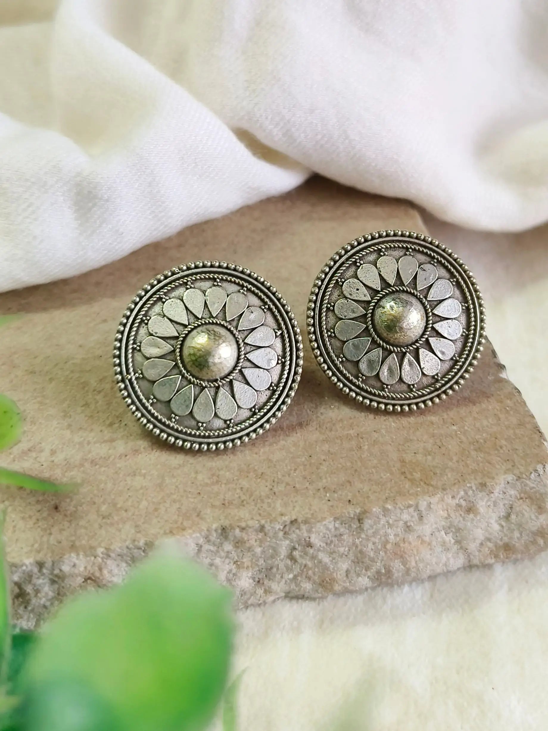 Add a touch of timeless elegance with these Oxidised Silver Plated Flower Design Stud Earrings from Sarichka. Featuring a beautiful floral motif in an antique oxidised finish, these earrings bring grace and charm to any outfit. Perfect for daily wear, office looks, festive celebrations, and special occasions, their lightweight design ensures all-day comfort. A versatile piece, they make a thoughtful gift for friends and loved ones. Pair them effortlessly with ethnic attire, Indo-western fusion, or even casual wear to create a chic and stylish look.