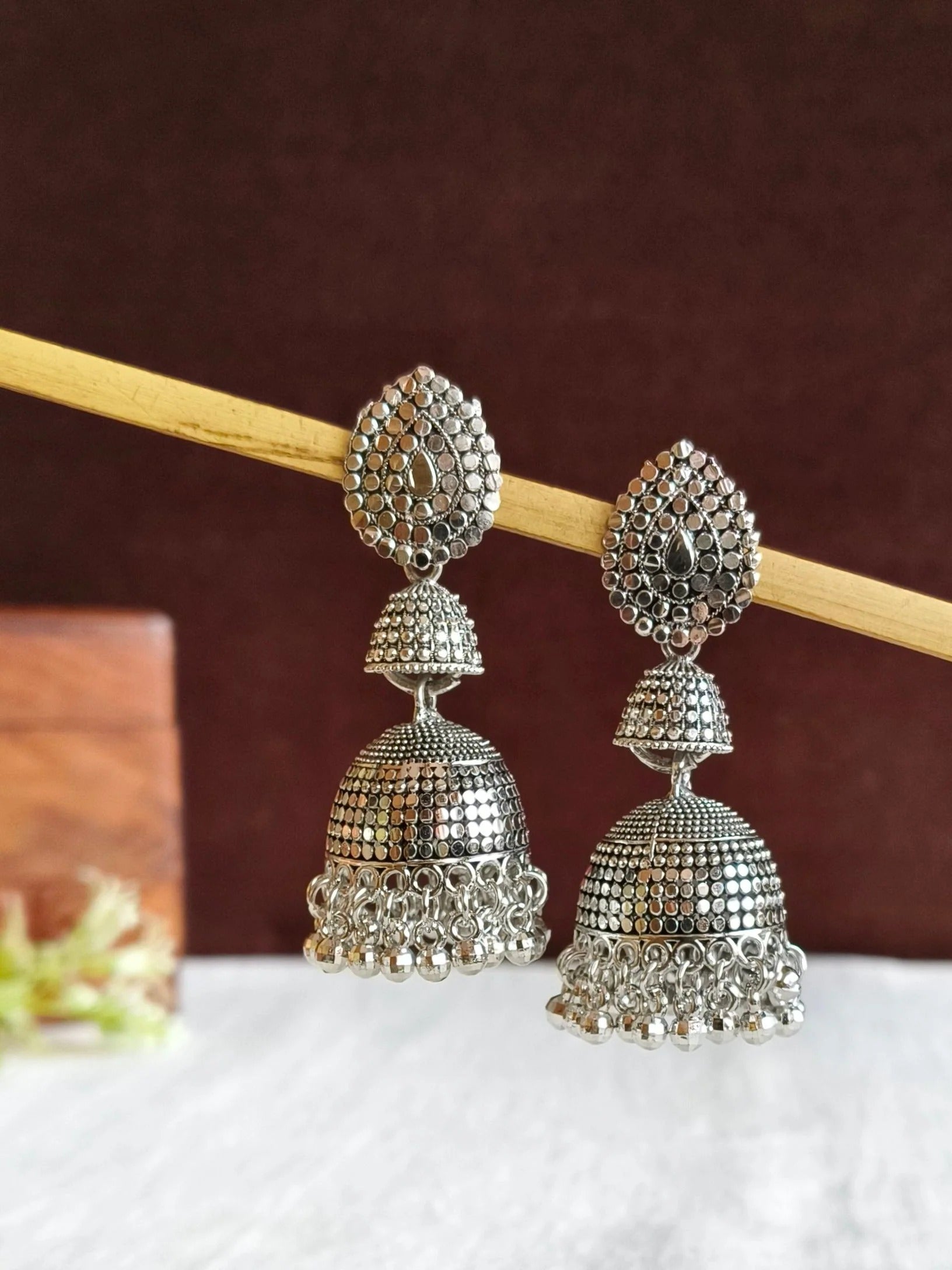 • Design Elements: Unique triple-tiered jhumka design with intricate carvings and ghungroo accents for a graceful look