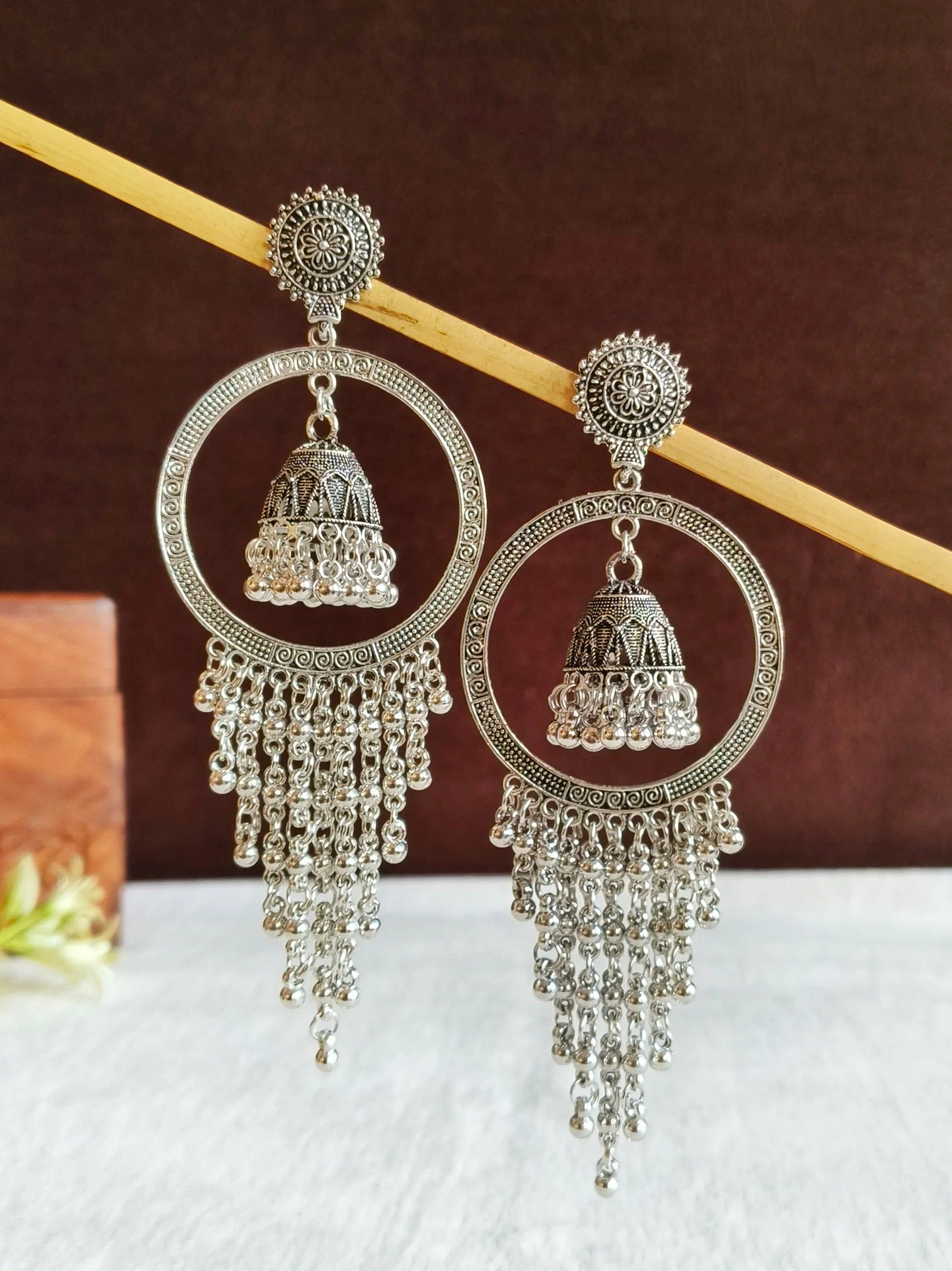 Enhance your ethnic elegance with these oxidized silver Jhumka Chandbali earrings, beautifully crafted to reflect traditional artistry with a bold statement look.