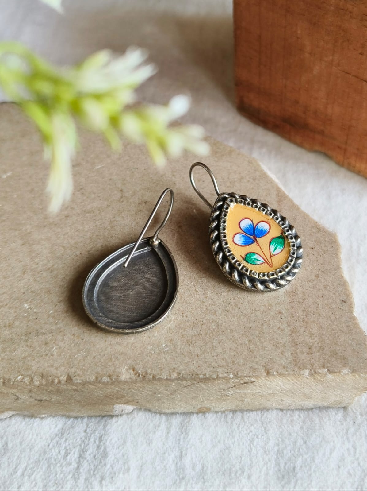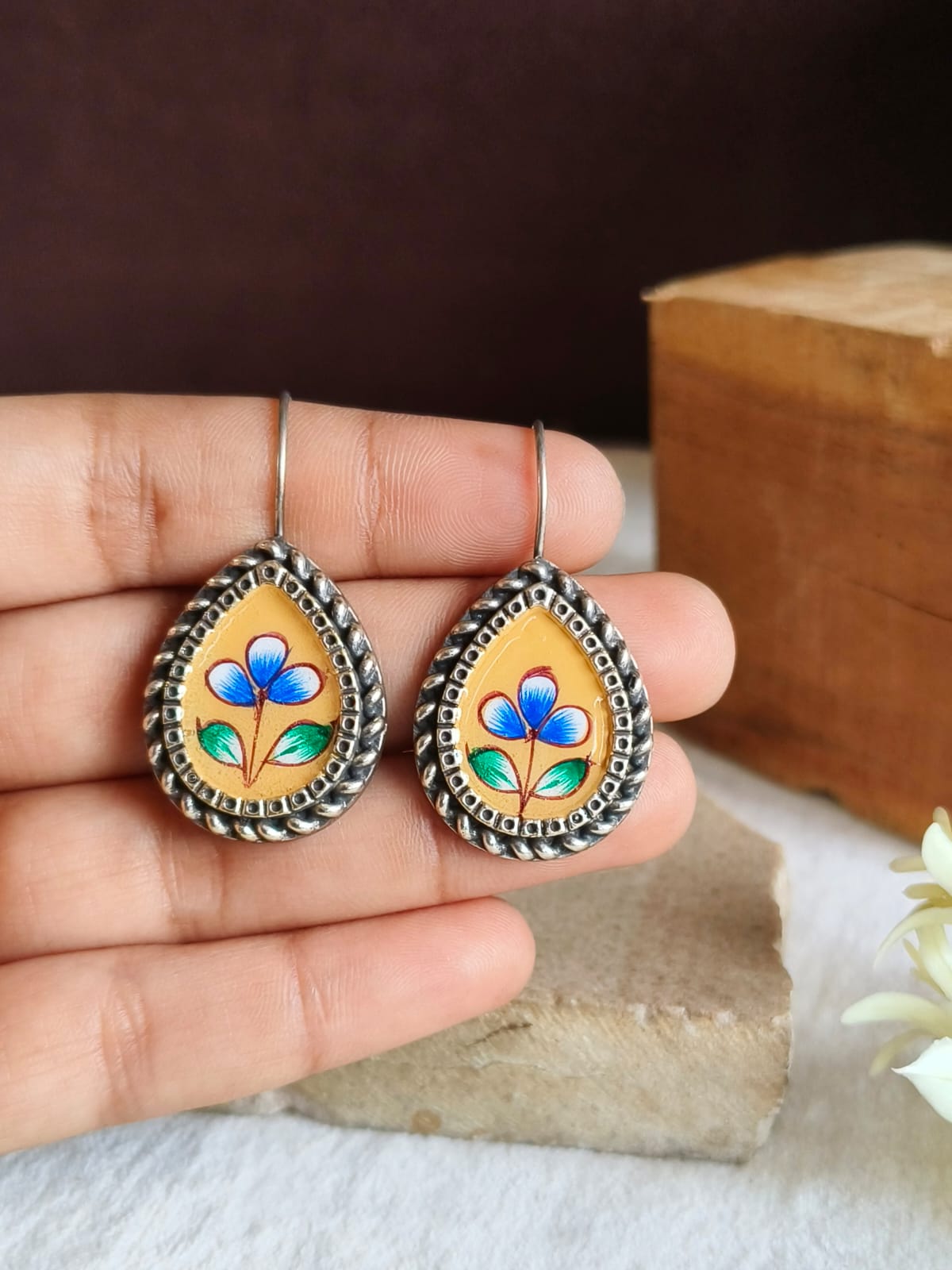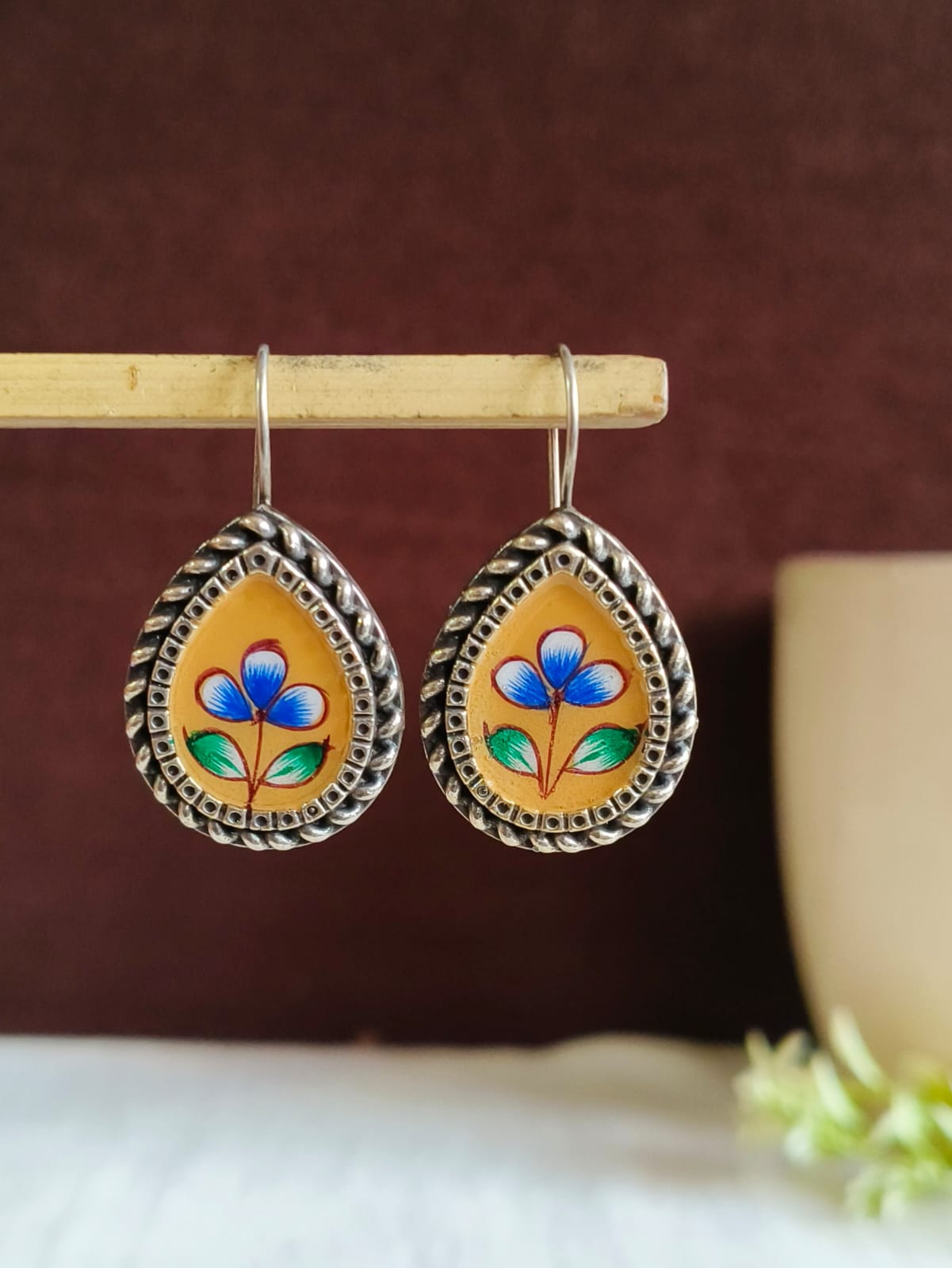 Design Elements: Beautiful teardrop-shaped earrings featuring vibrant yellow enamel with a delicate hand-painted floral motif and intricate oxidized border detailing.
