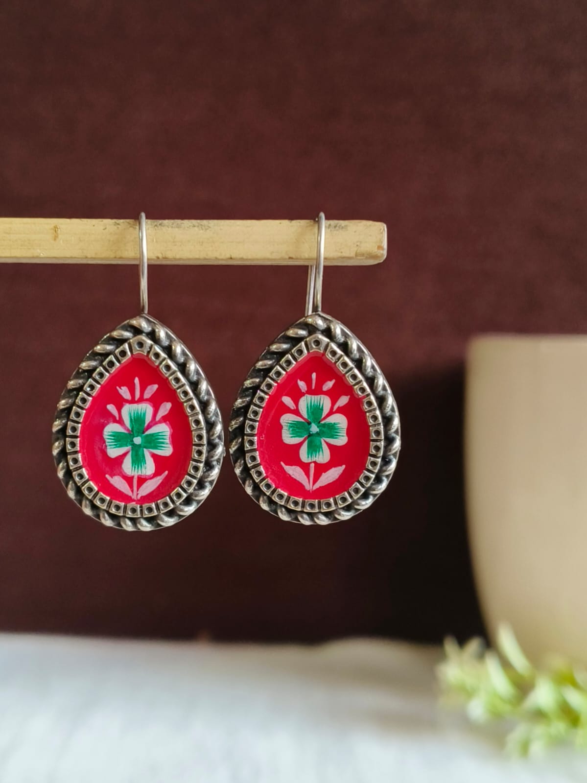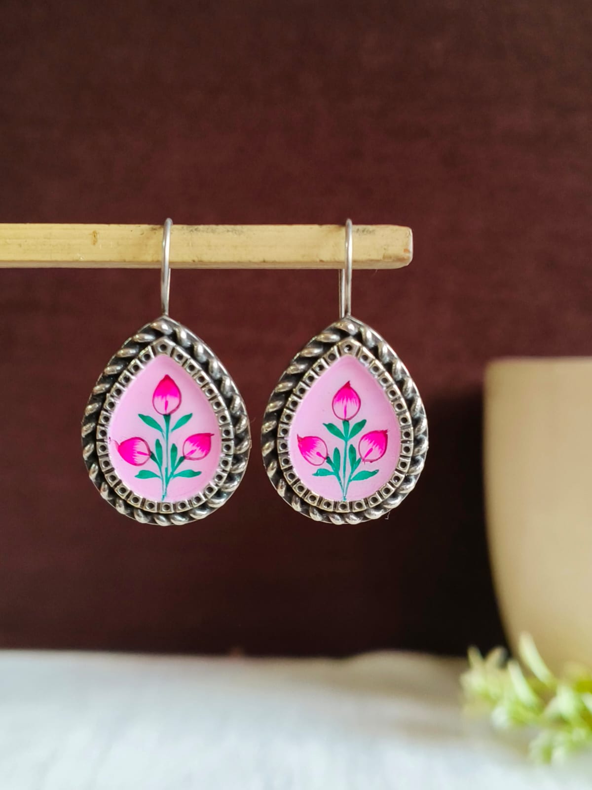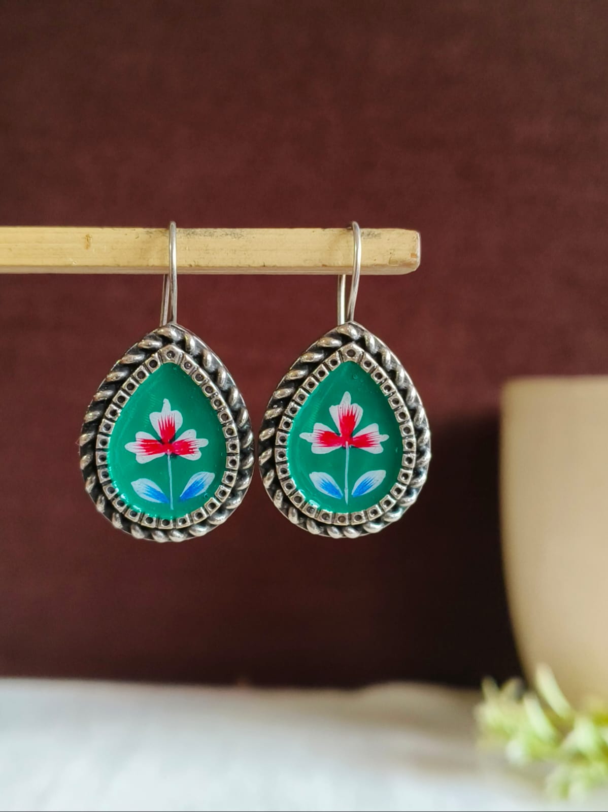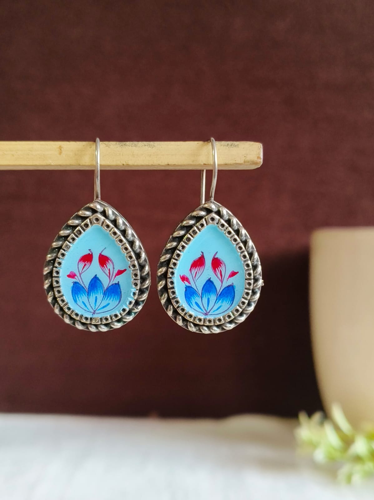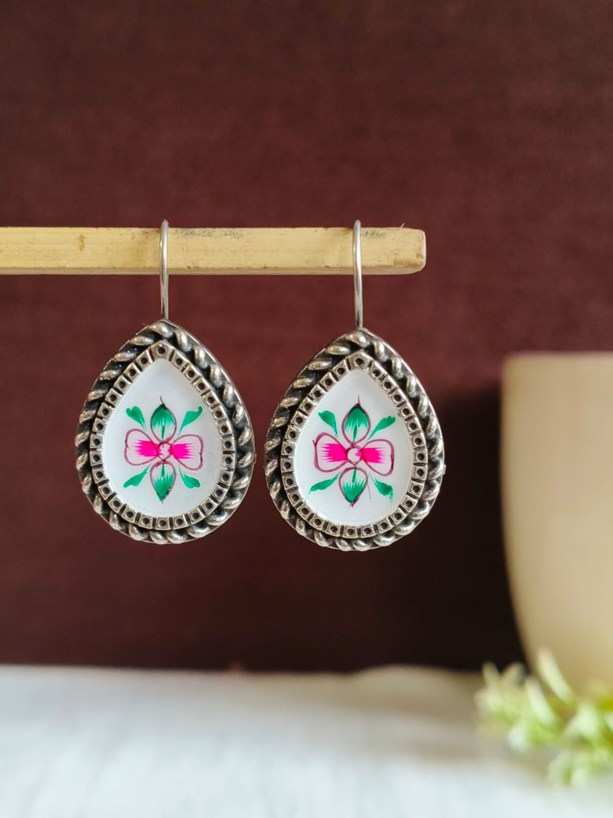 Oxidized Silver Floral Hand-Painted Earring