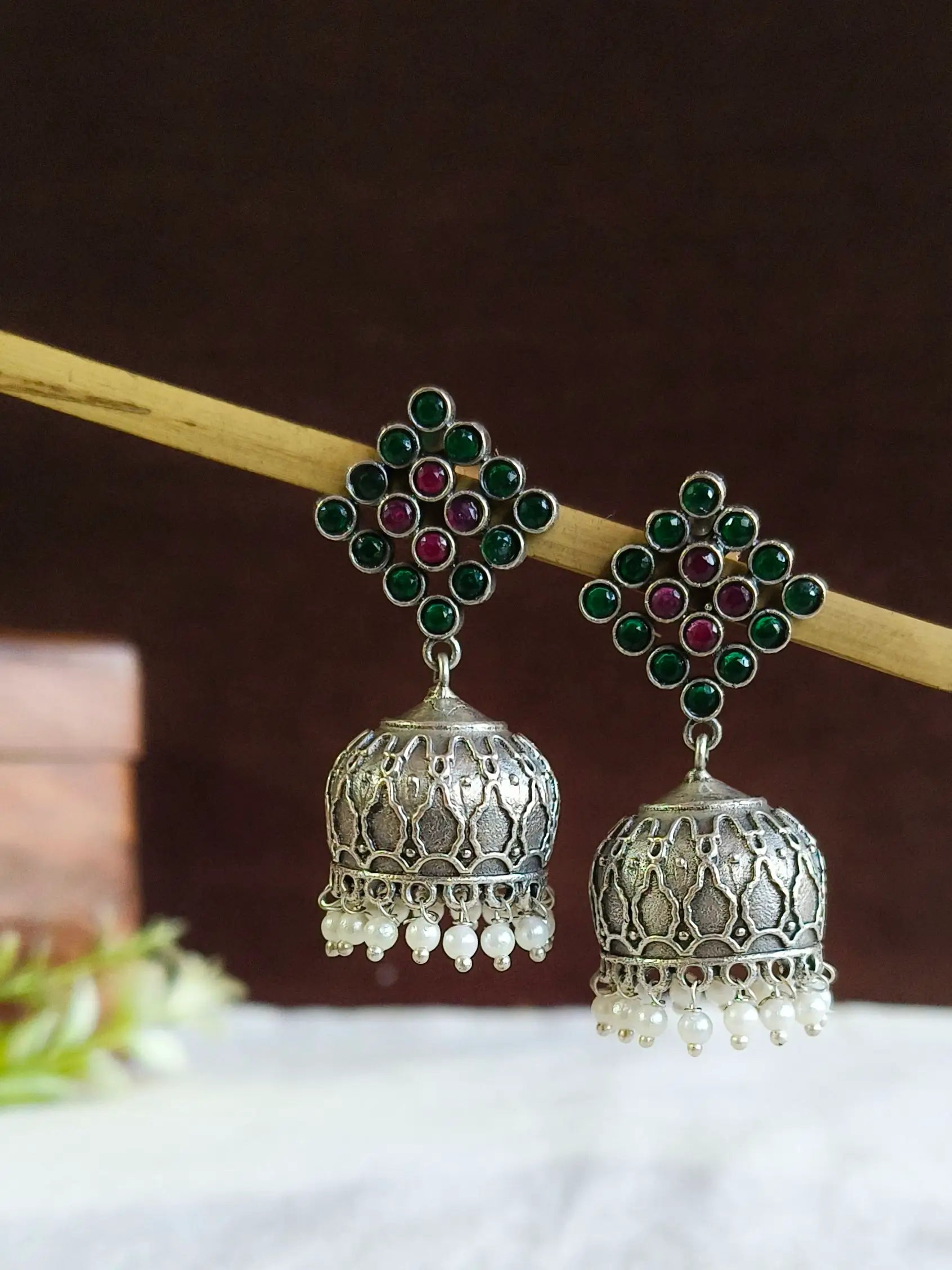 Oxidized Silver Jhumka with Stone & Pearl | Sarichka
