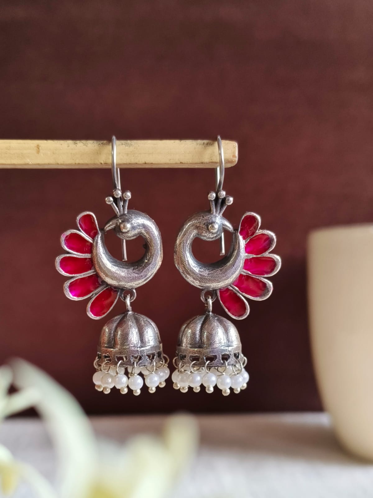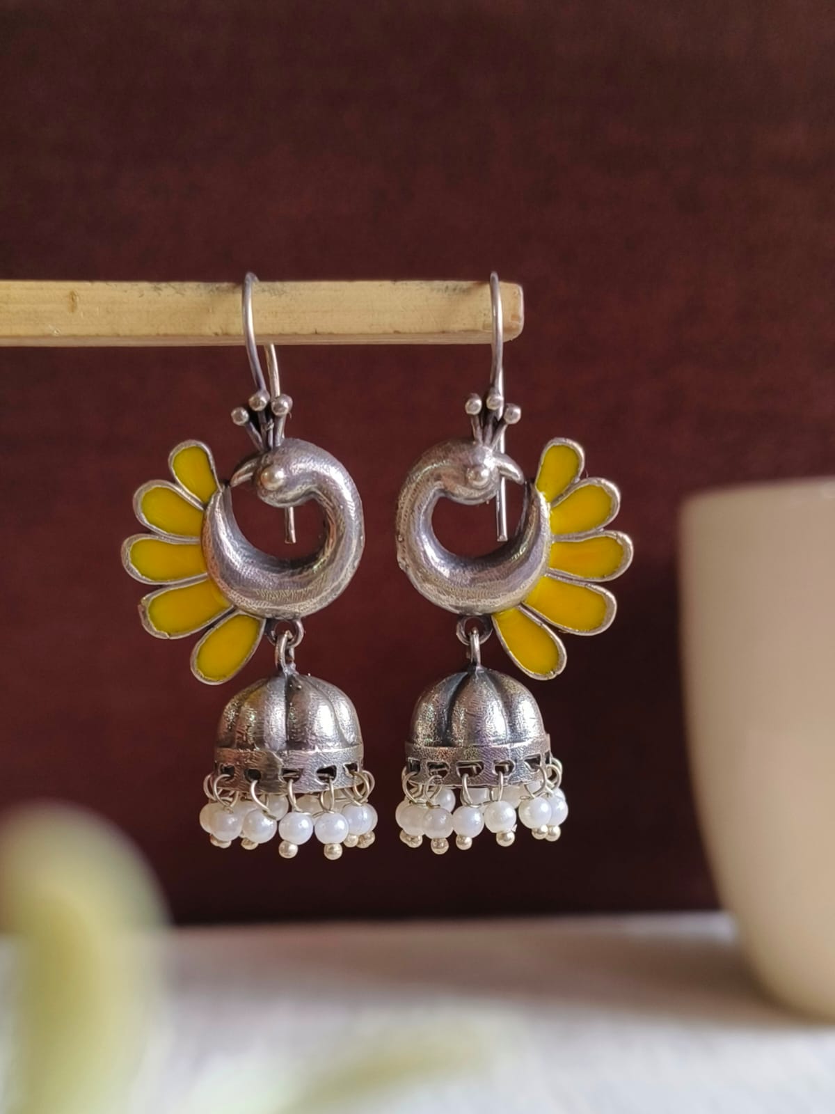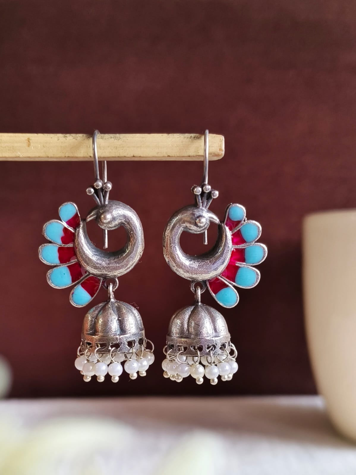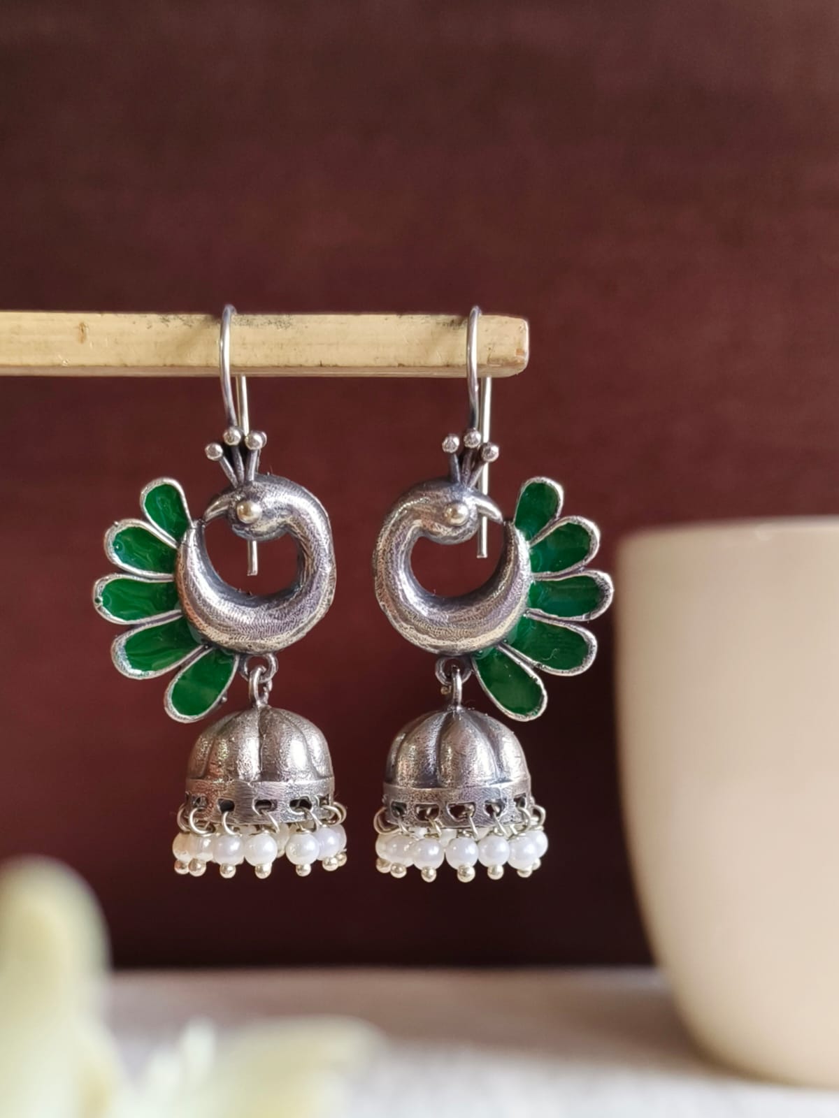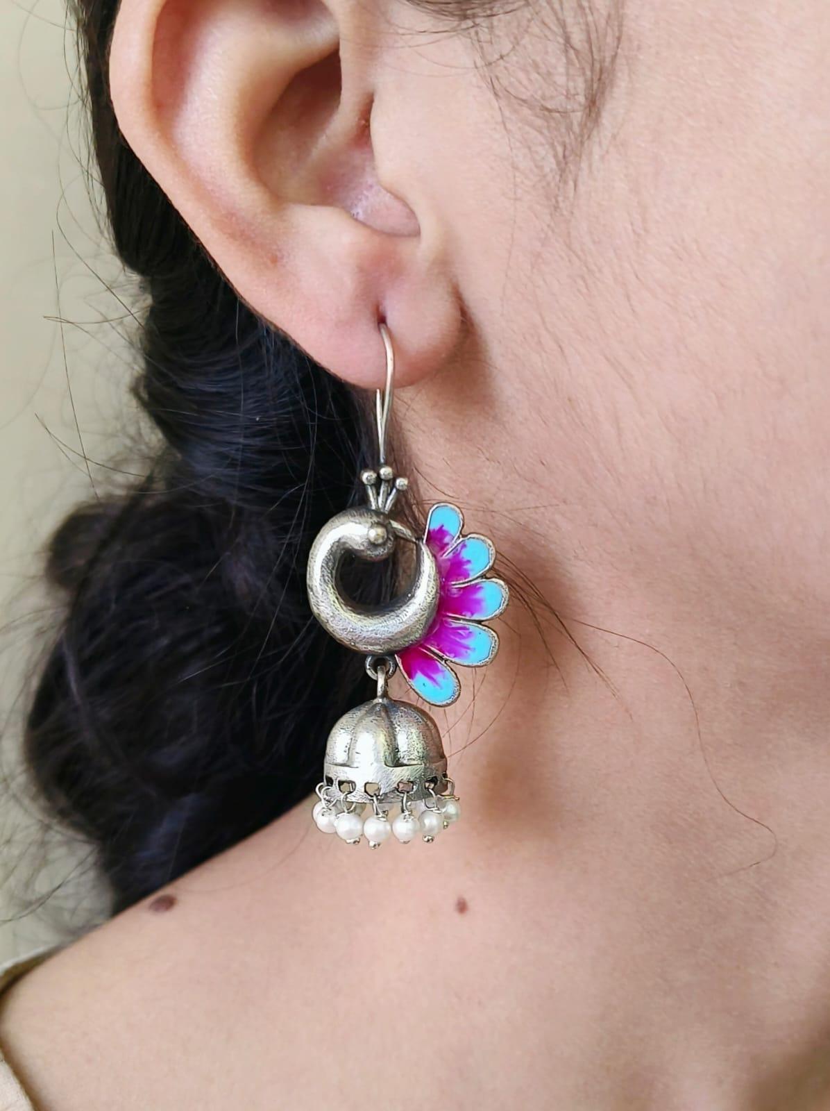 Give a hint of sophistication in your jewelry collection with your collection of peacock oxidized Jhumka Earrings The pair is both elegant and beautiful.