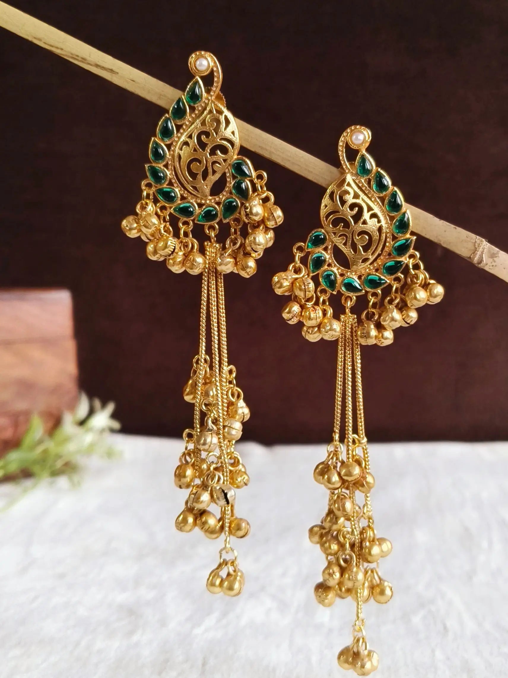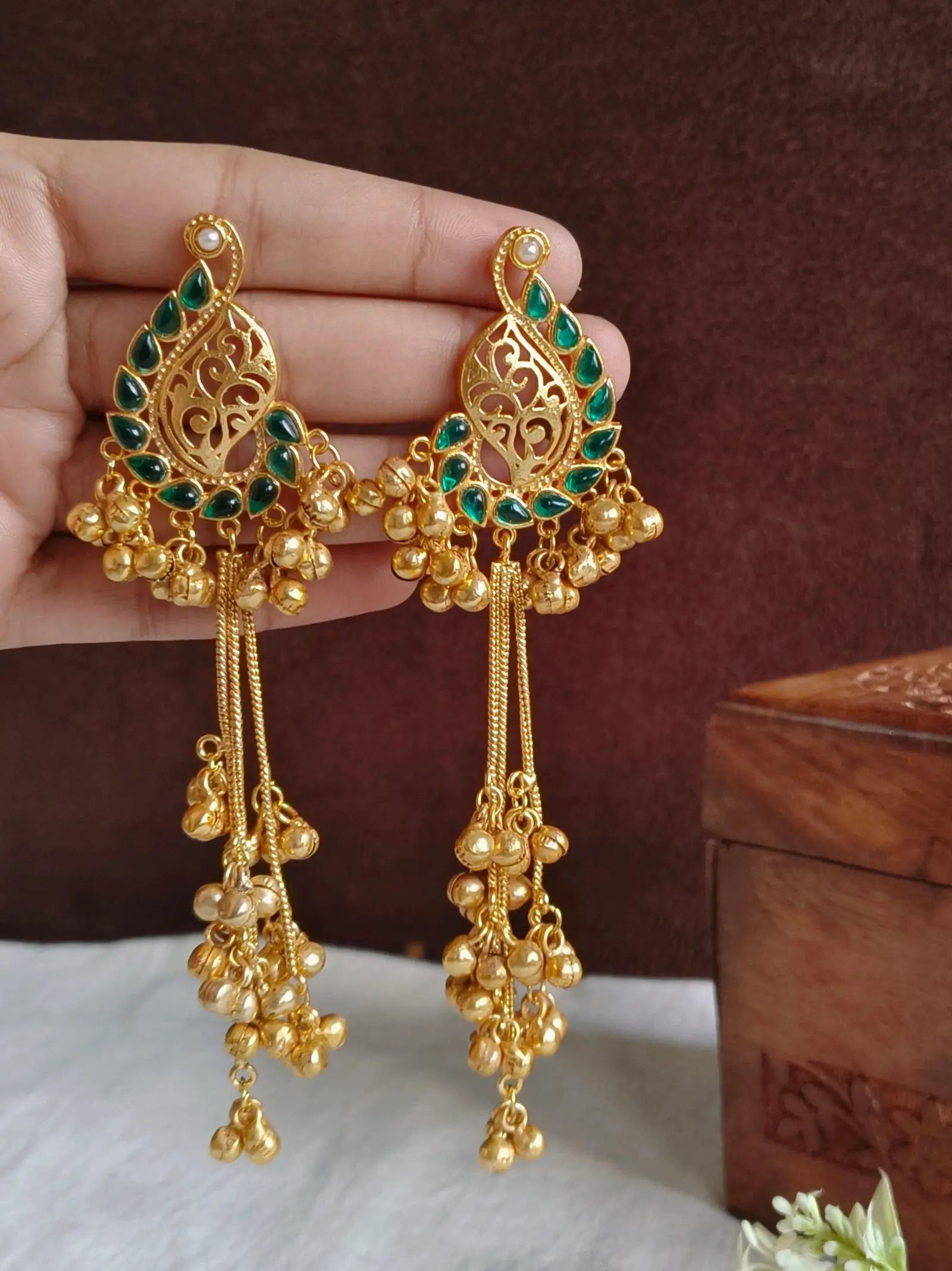 Elevate your ethnic charm with these stunning Kashmiri long drop earrings featuring bold red stones and elegant gold-toned ghungroo beaded drops. Their handcrafted detailing and traditional finish make them perfect for festivals, weddings, parties, and special occasions. Lightweight yet statement-making, they pair beautifully with sarees, lehengas, anarkalis, and Indo-fusion wear. A thoughtful and stylish gift option, these earrings add sophistication and cultural flair to any look. Add them to your jewelry collection to experience timeless Kashmiri craftsmanship blended with modern elegance.
