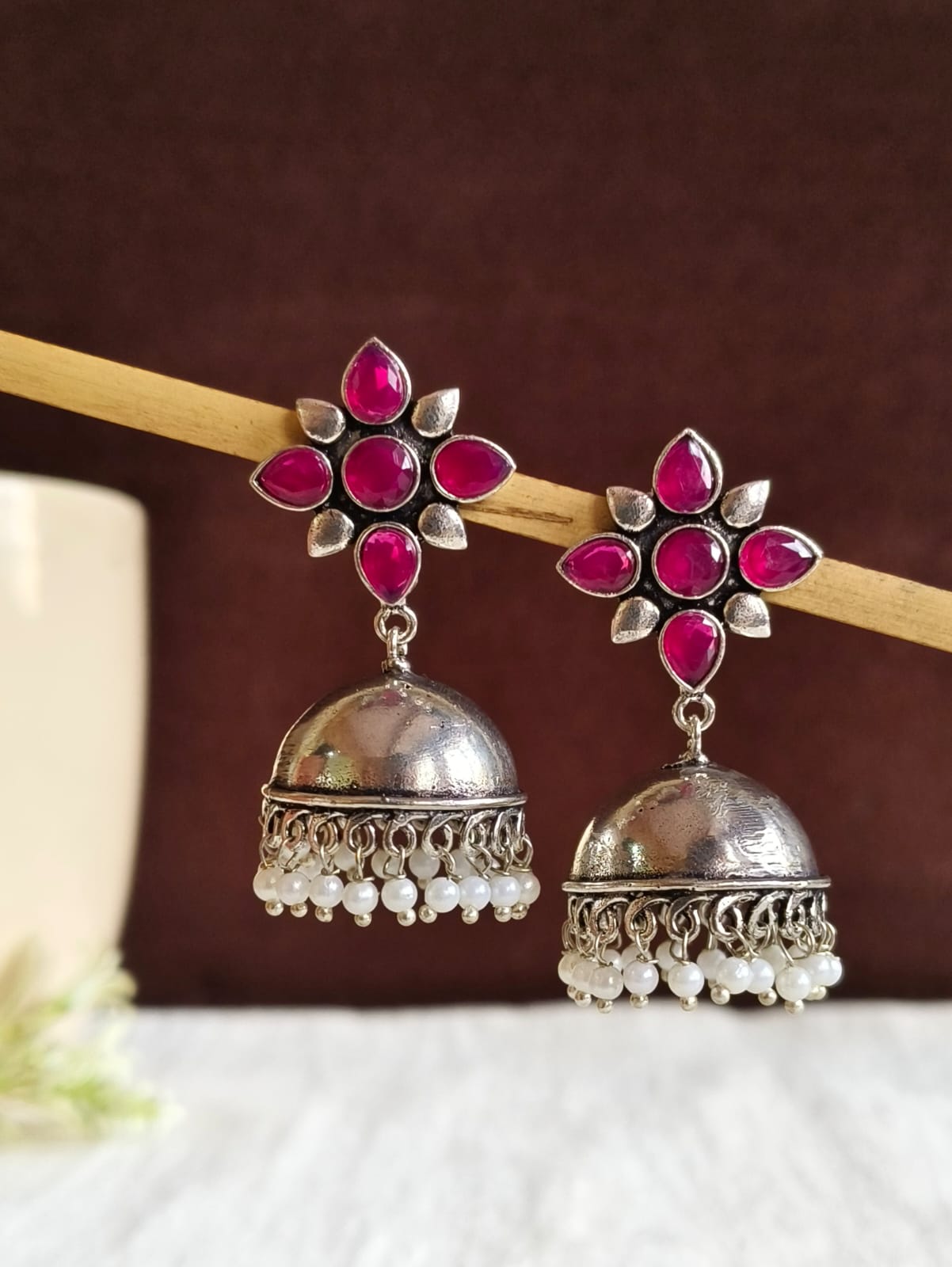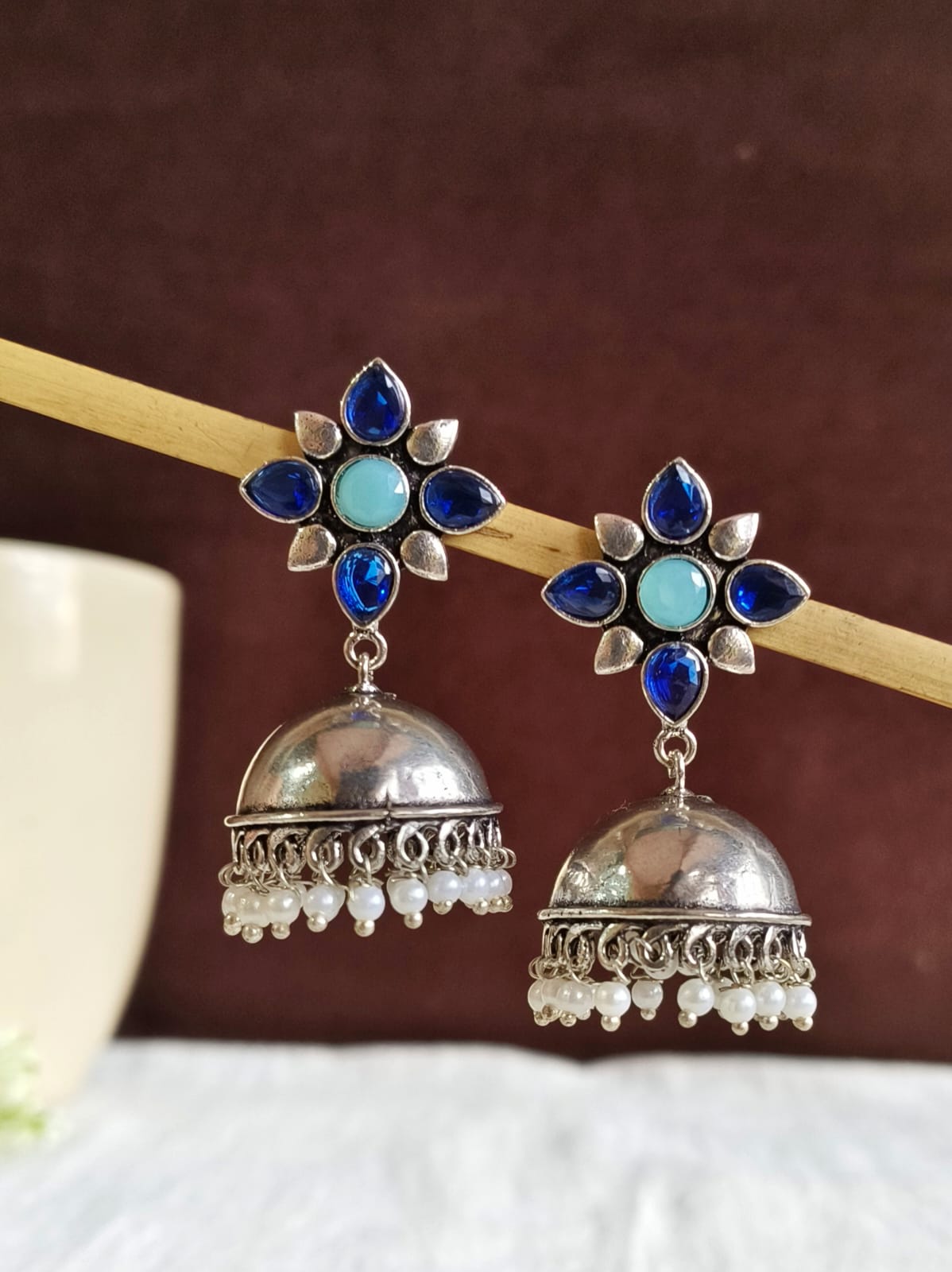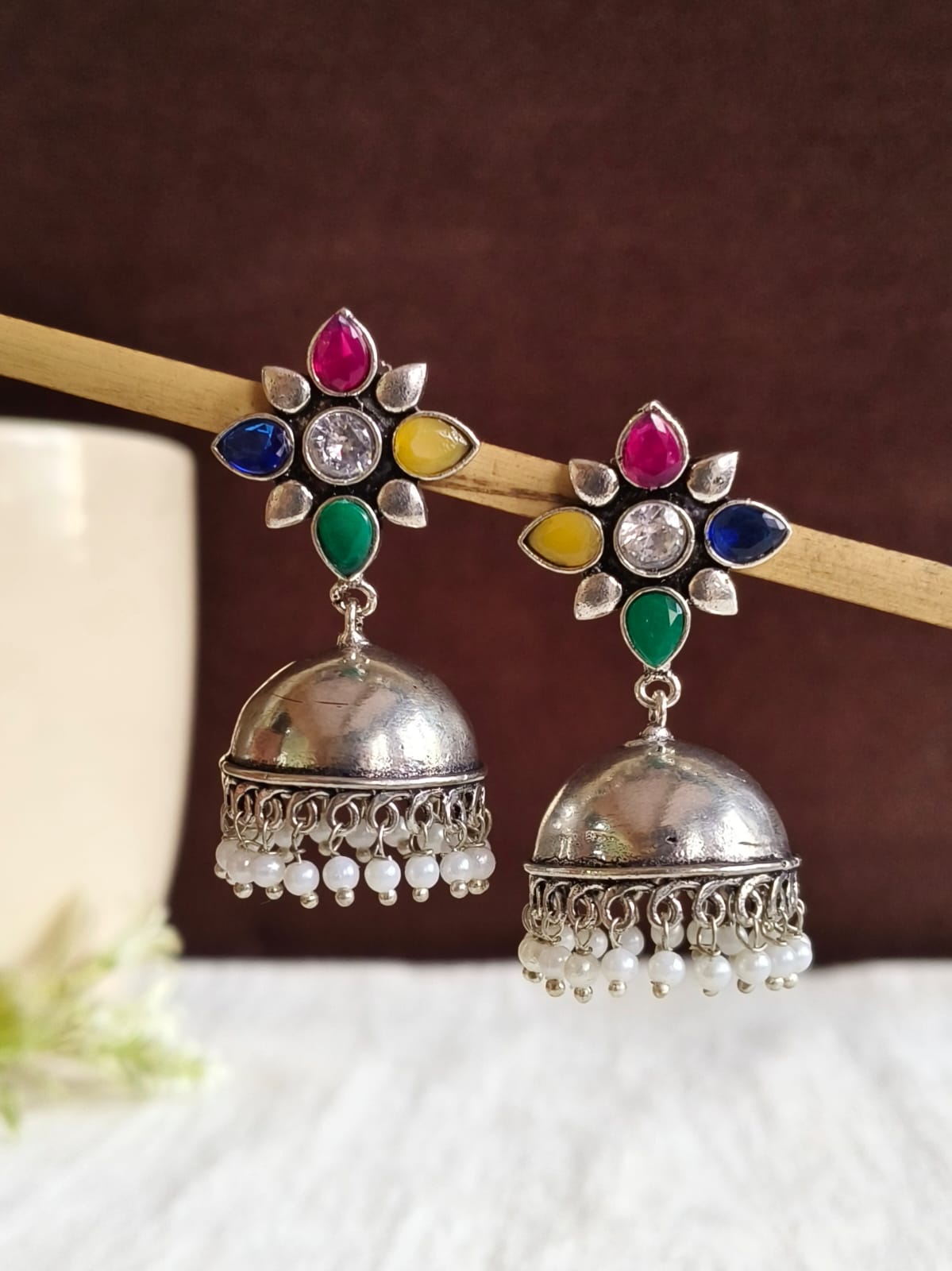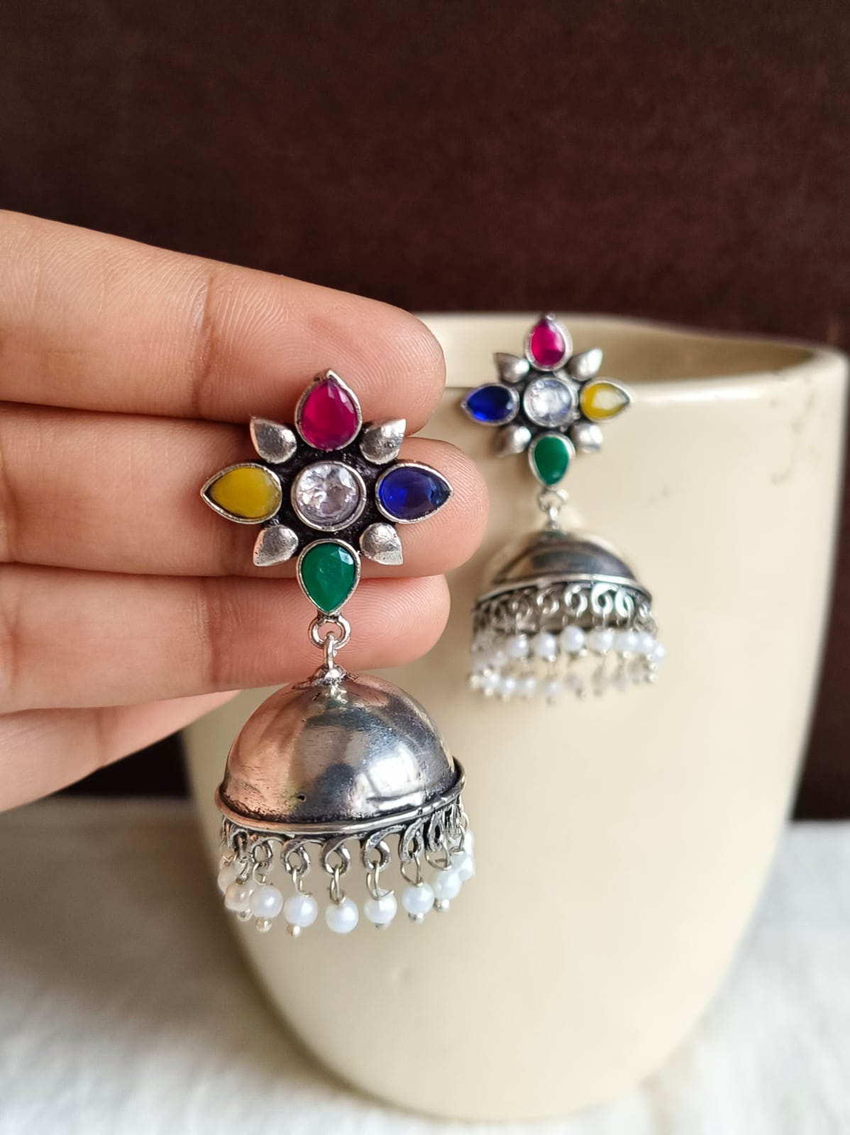 These trendy German silver pearl jhumka earrings offer a sophisticated and timeless look for every occasion. Perfect for adding a stylish touch to any outfit, they feature a blend of intricate silver detailing and elegant pearls.