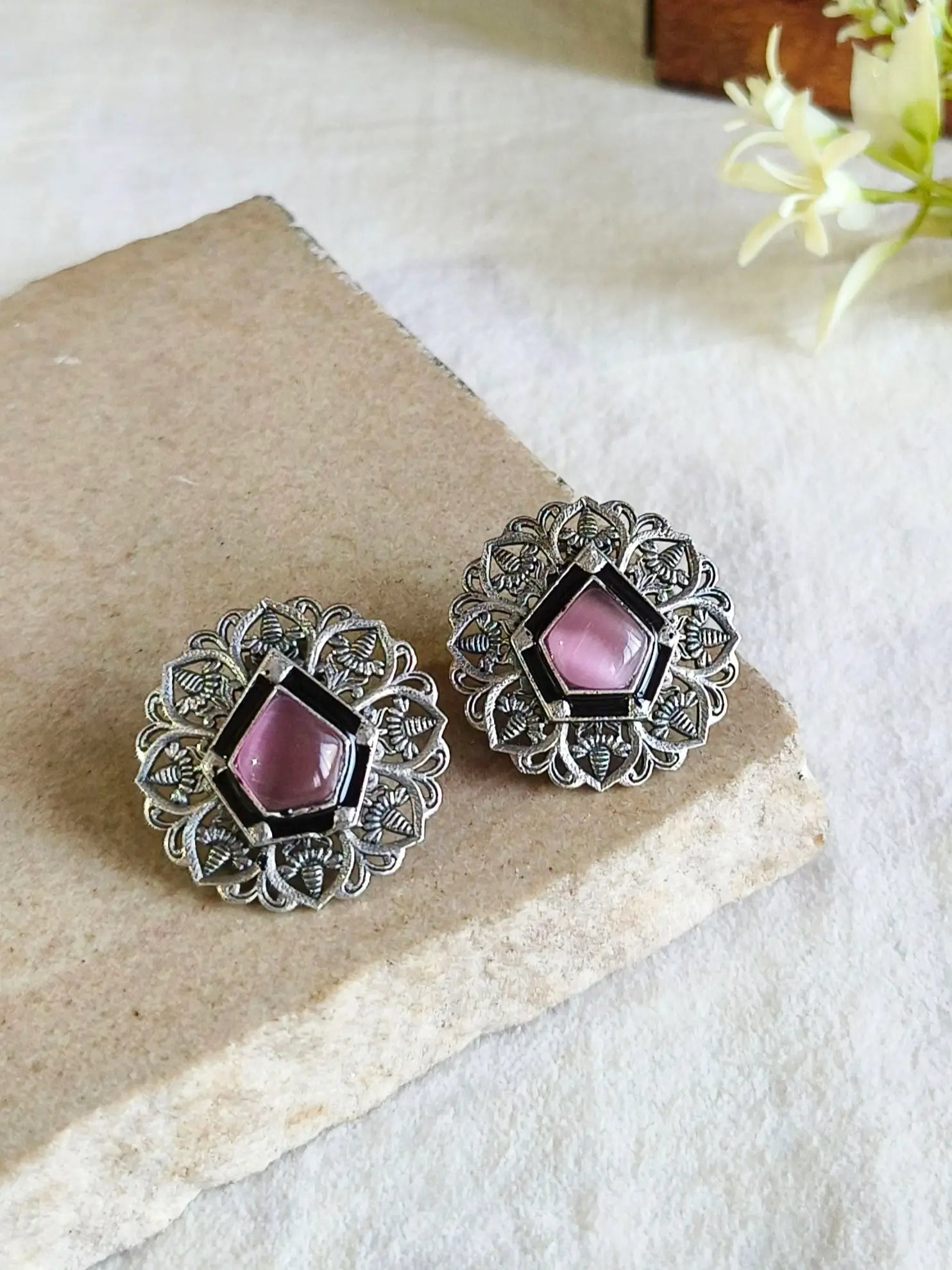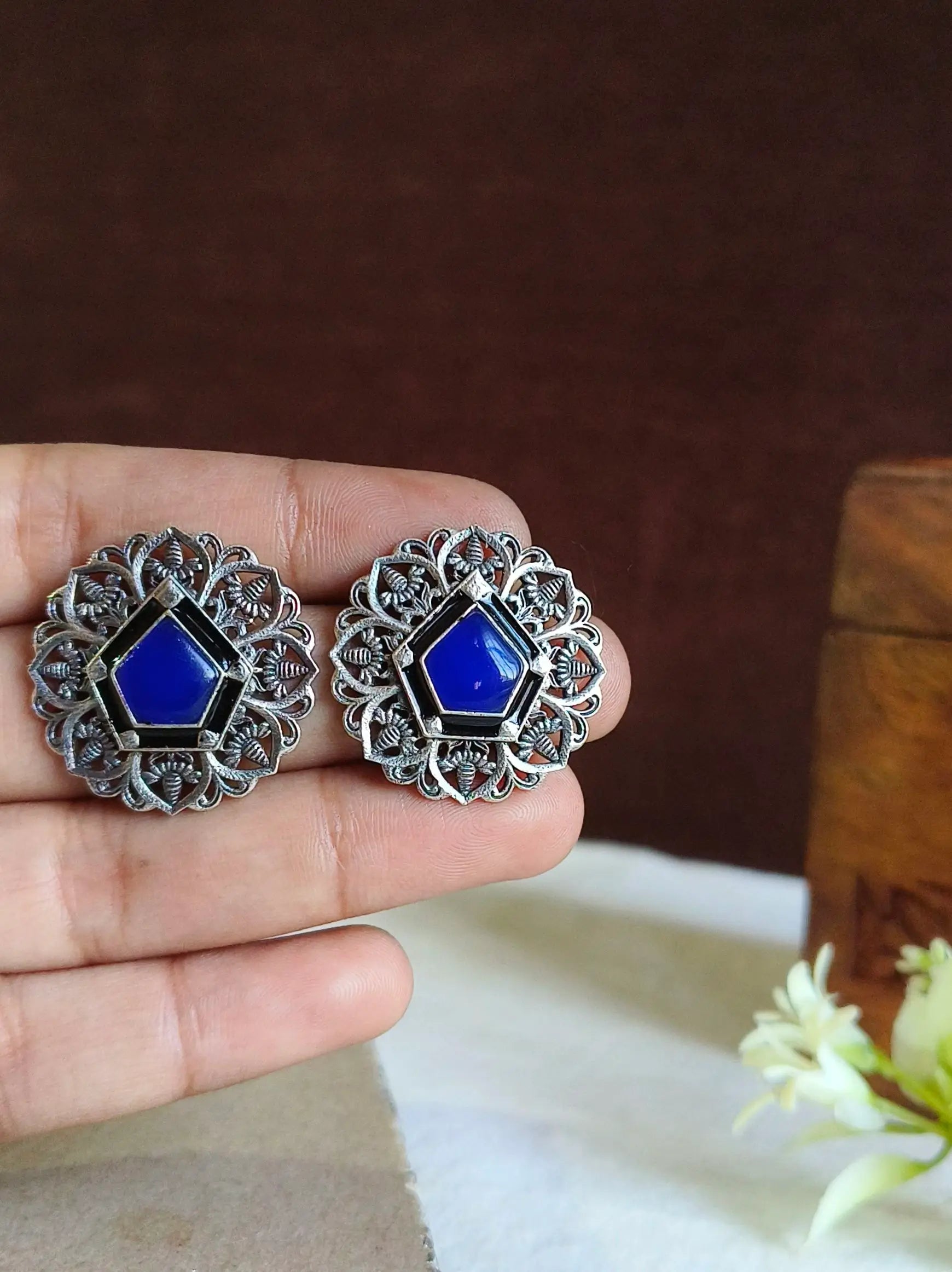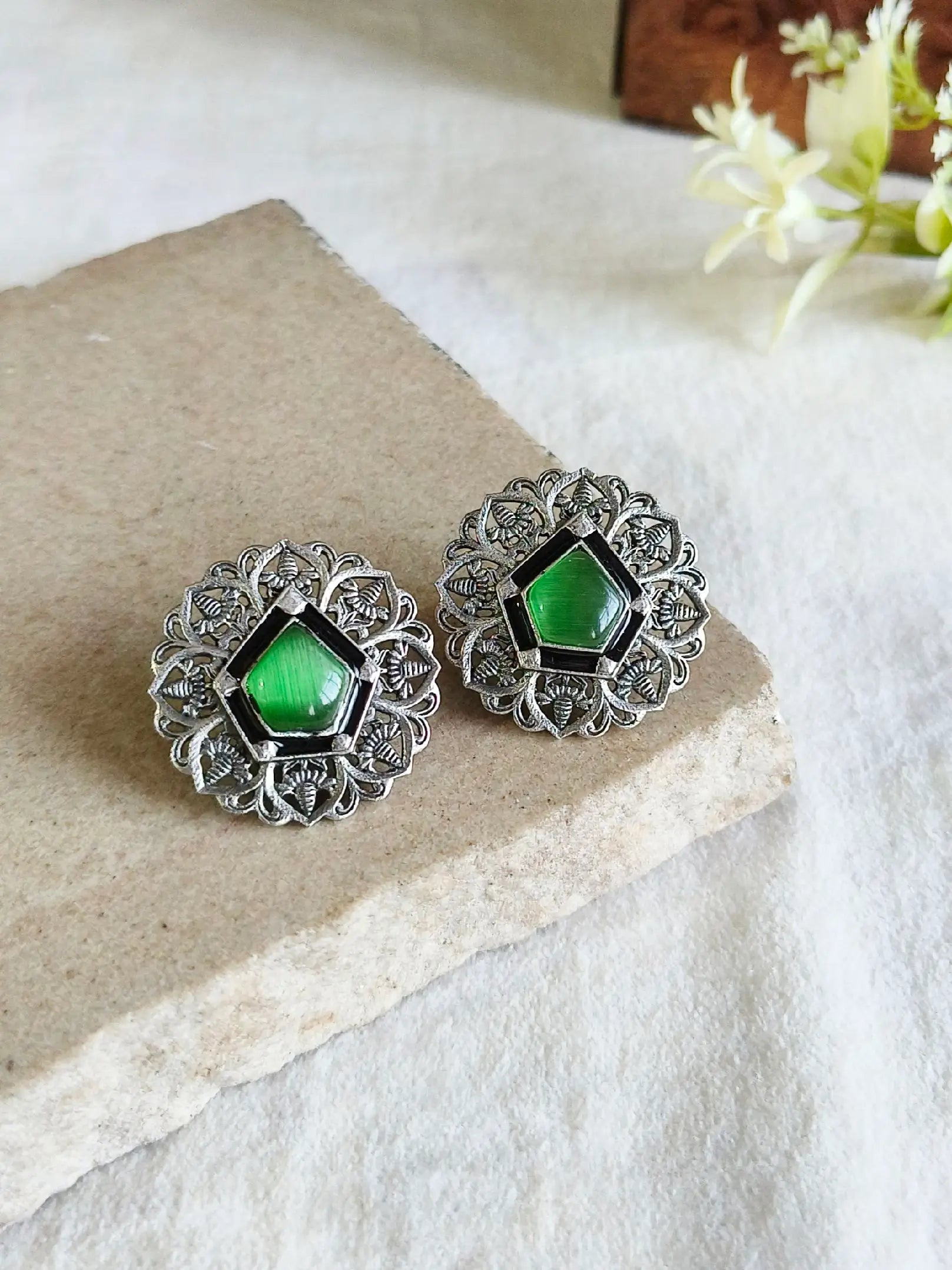 Elevate your style with these silver look-a-like oxidised stud earrings, featuring a stunning gemstone center that adds vibrant elegance. The oxidised silver finish enhances their vintage appeal, making them perfect for office wear, daily wear, festive events, and casual outings. Lightweight and classy, they also make a thoughtful gift for birthdays, anniversaries, or special moments. Pair them effortlessly with traditional kurtis, western tops, or fusion outfits to create a polished, versatile look for any occasion.
