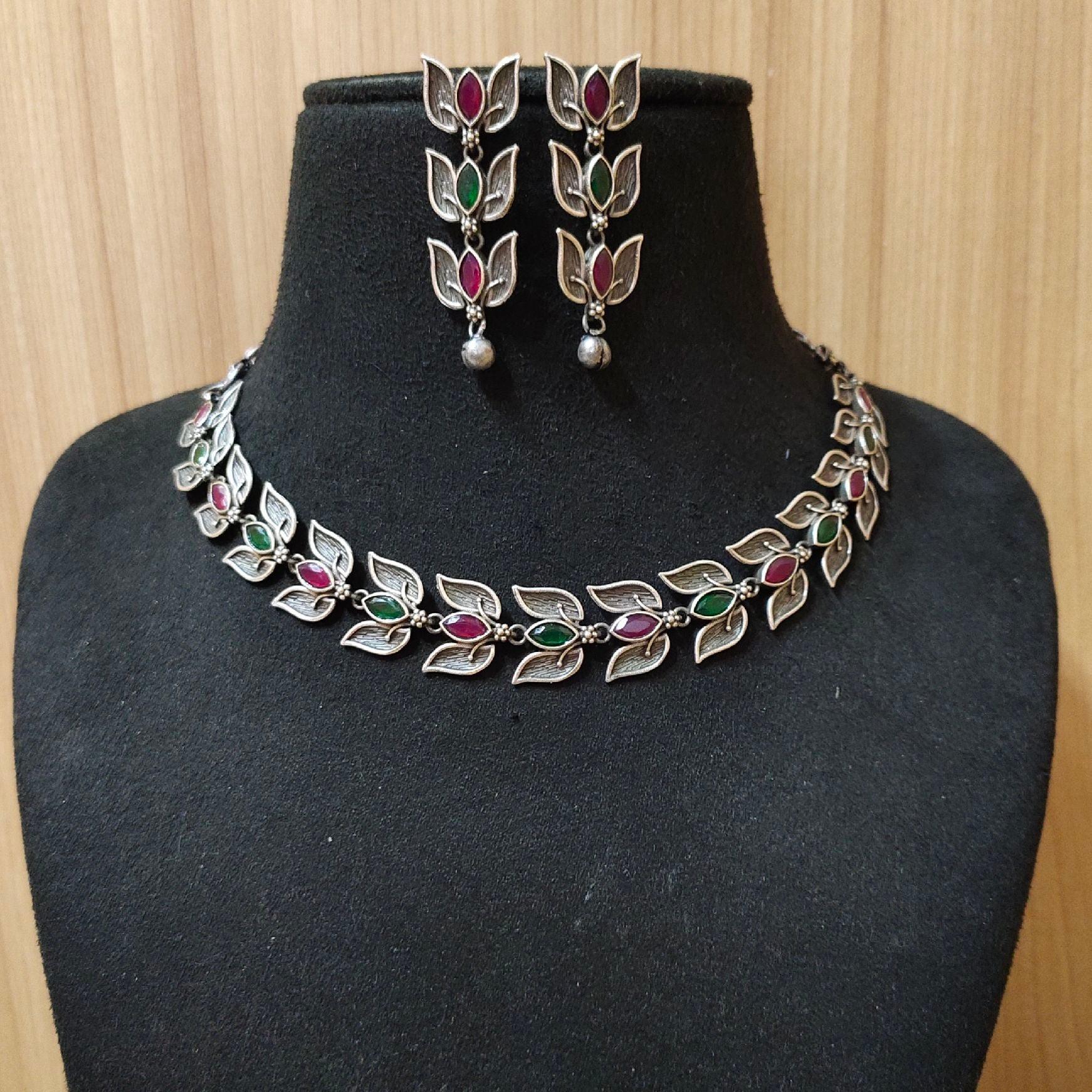 This stunning silver-look-alike leaf style necklace set with dangler earrings adds a sophisticated touch to your jewelry collection. The leaf motif reflects nature's beauty, making it perfect for weddings, parties, or any special occasion. The high-quality silver finish enhances its elegance, while the dangler earrings bring a dynamic flair to your ensemble. This set is not only a stylish addition to your wardrobe but also a perfect gift for someone special. Whether styled with traditional attire or a contemporary fusion look, it adds timeless elegance. Get yours today at Sarichka Fashion!
