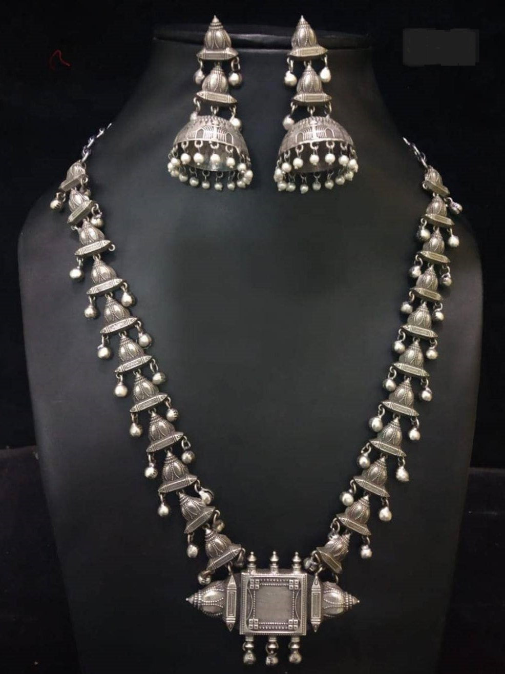 This silver look-alike necklace set with jhumkas is the perfect accessory to shine during Garba and other festive celebrations!