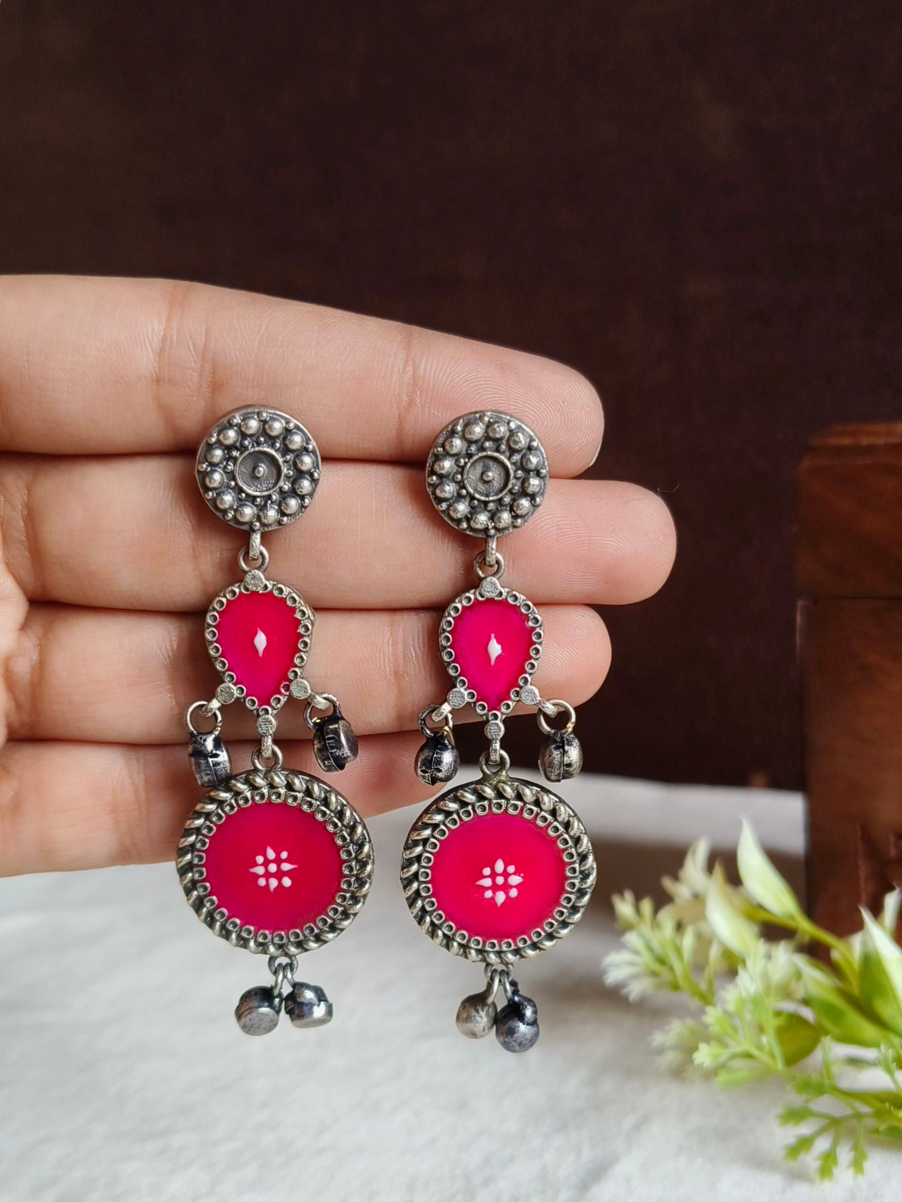 Elevate your look with these stunning Silver Polish Hand-Painted Meenakari Dangler Earrings from Sarichka. Designed with intricate artistry, these earrings blend tradition with modern elegance.