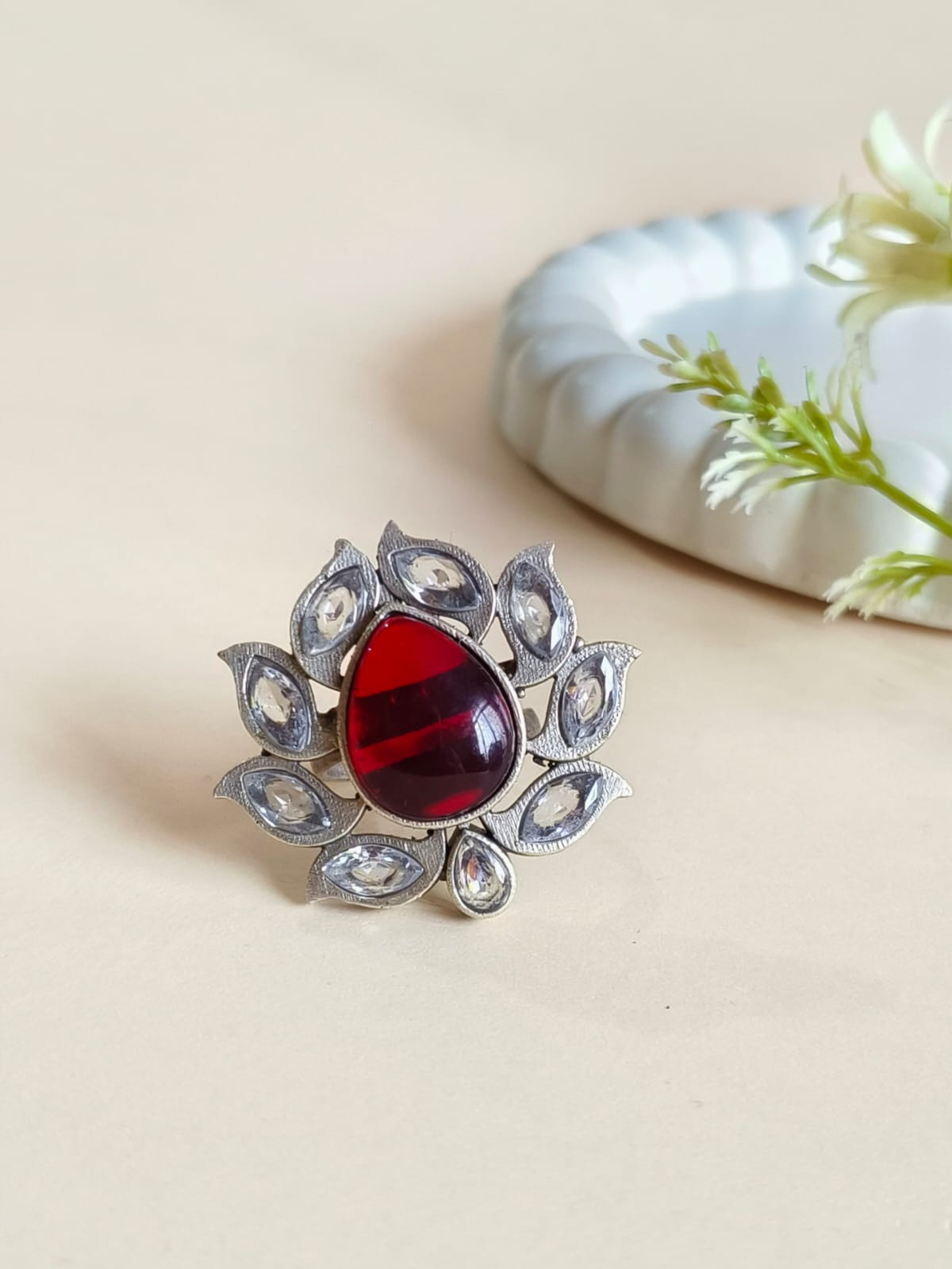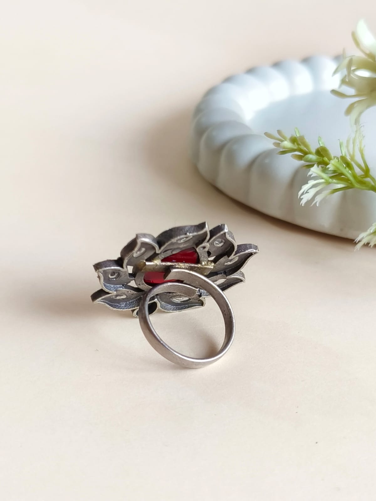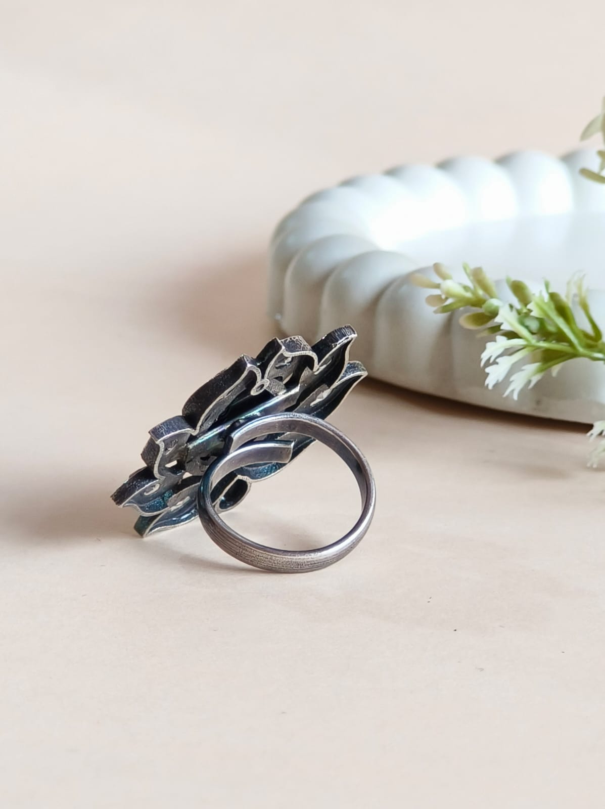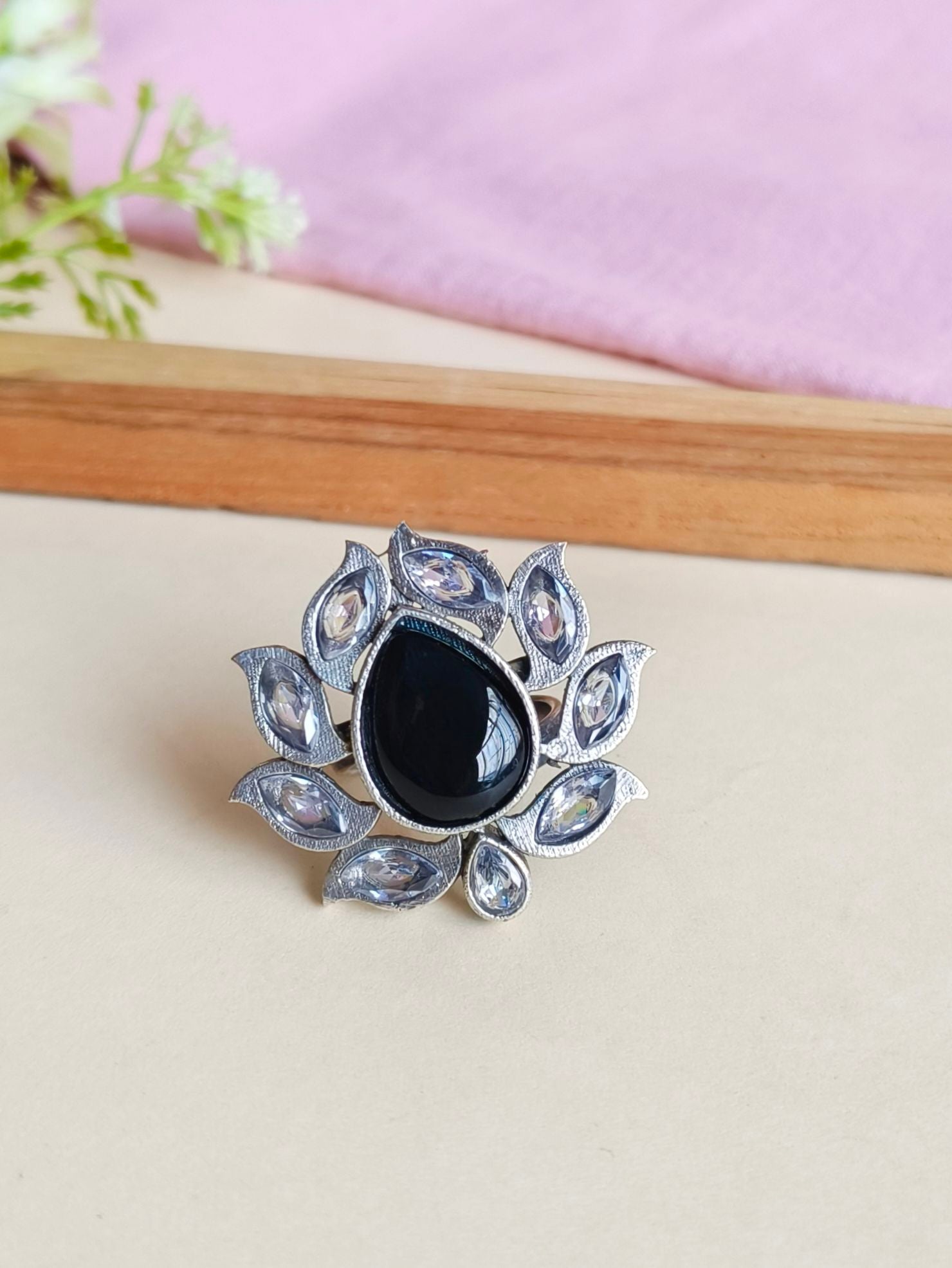 Improve your style by putting on our Stone Stud Lotus Oxidised Rings. Made with precision from sturdy brass, and featuring sleek sterling silver plating. These rings were created to be a standout. The intricately oxidized details with striking stones make for a stylish style that blends modern fashion with old-fashioned charm.