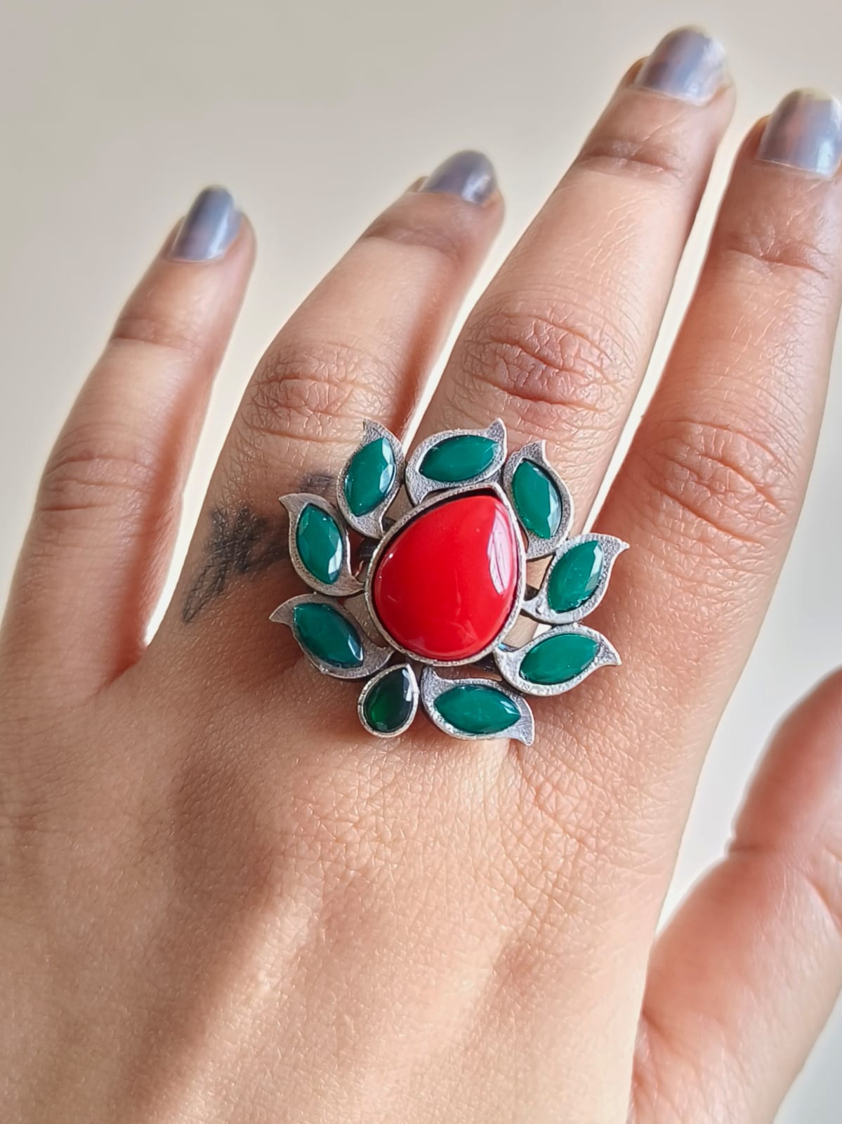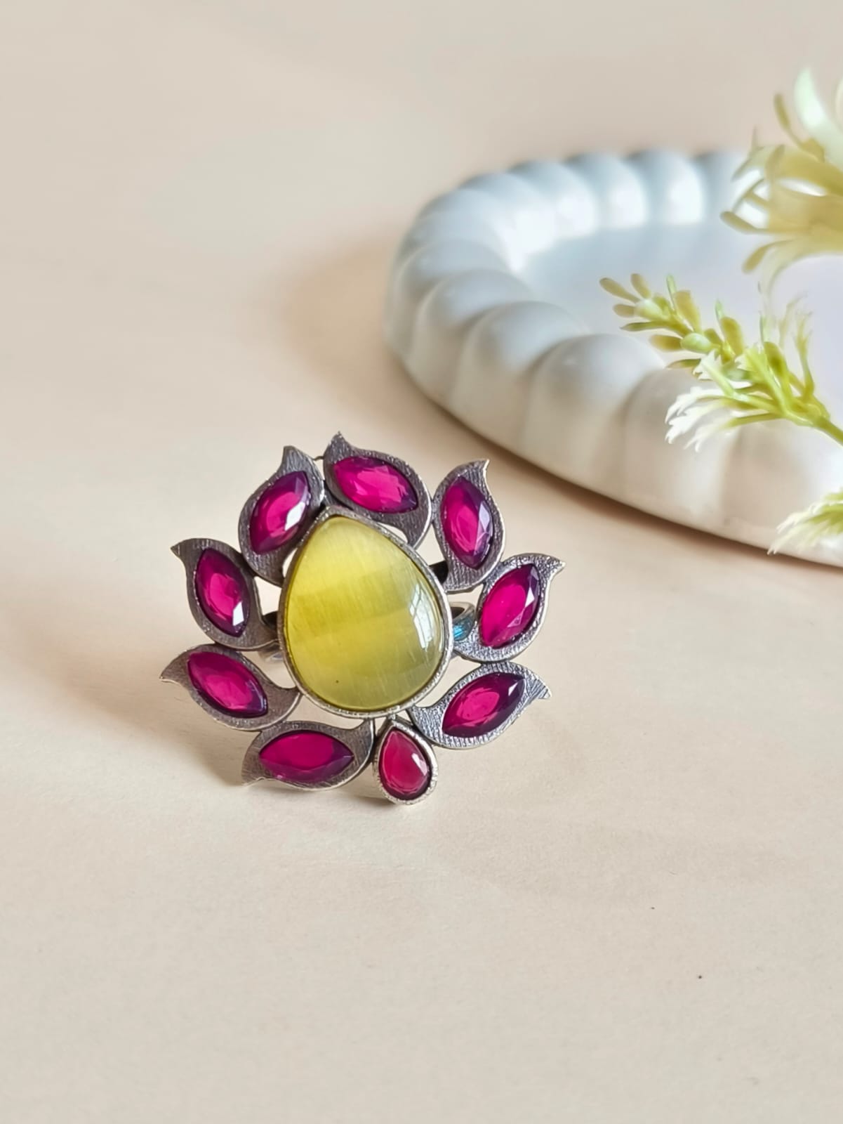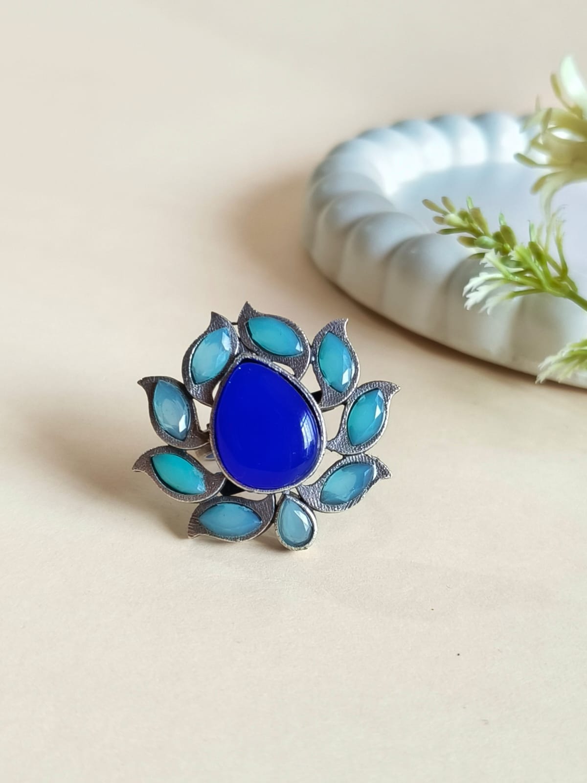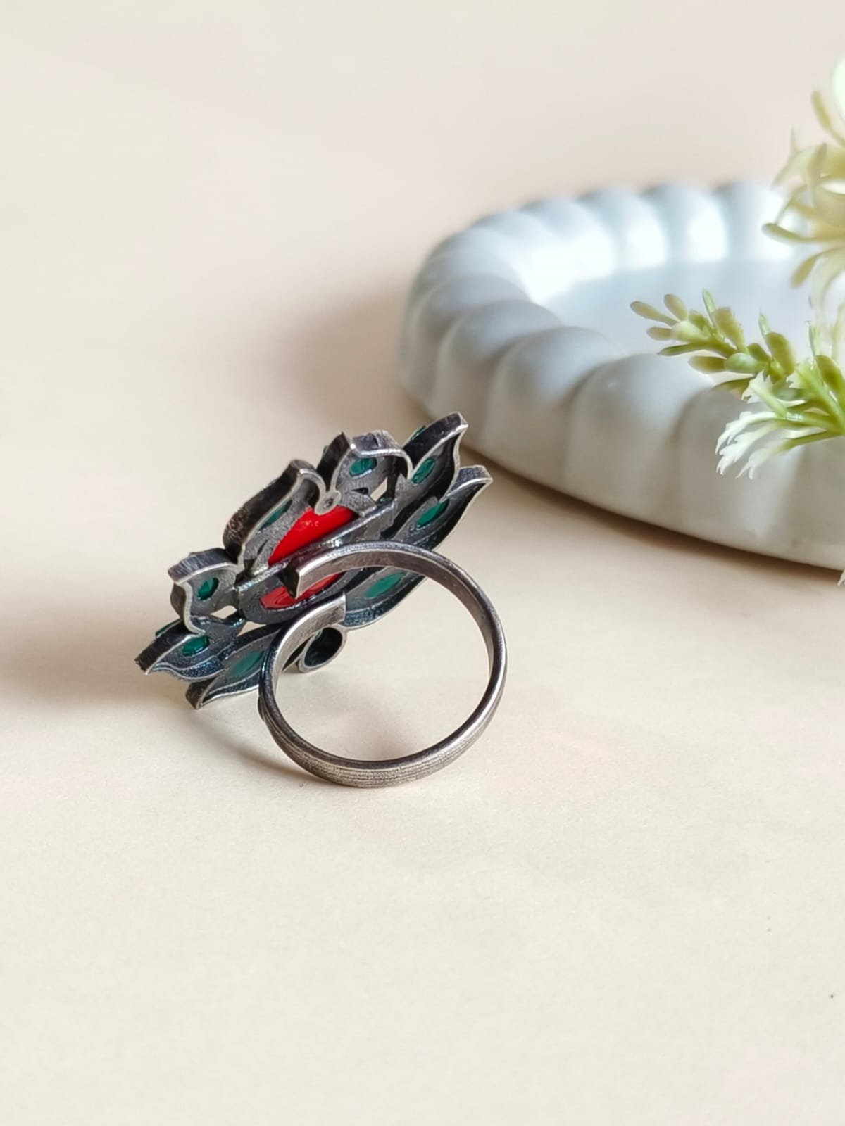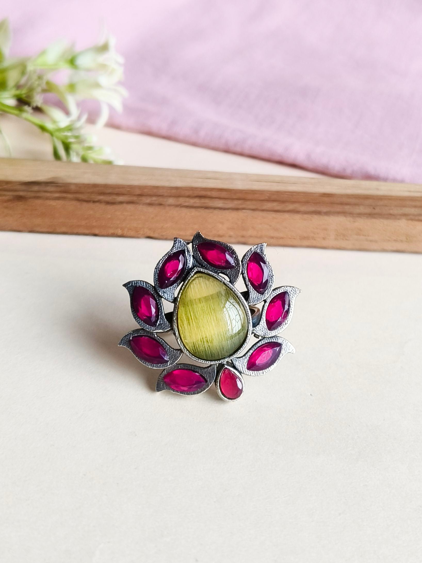 Improve your style by putting on our Stone Stud Lotus Oxidised Rings. Made with precision from sturdy brass, and featuring sleek sterling silver plating. These rings were created to be a standout. The intricately oxidized details with striking stones make for a stylish style that blends modern fashion with old-fashioned charm.