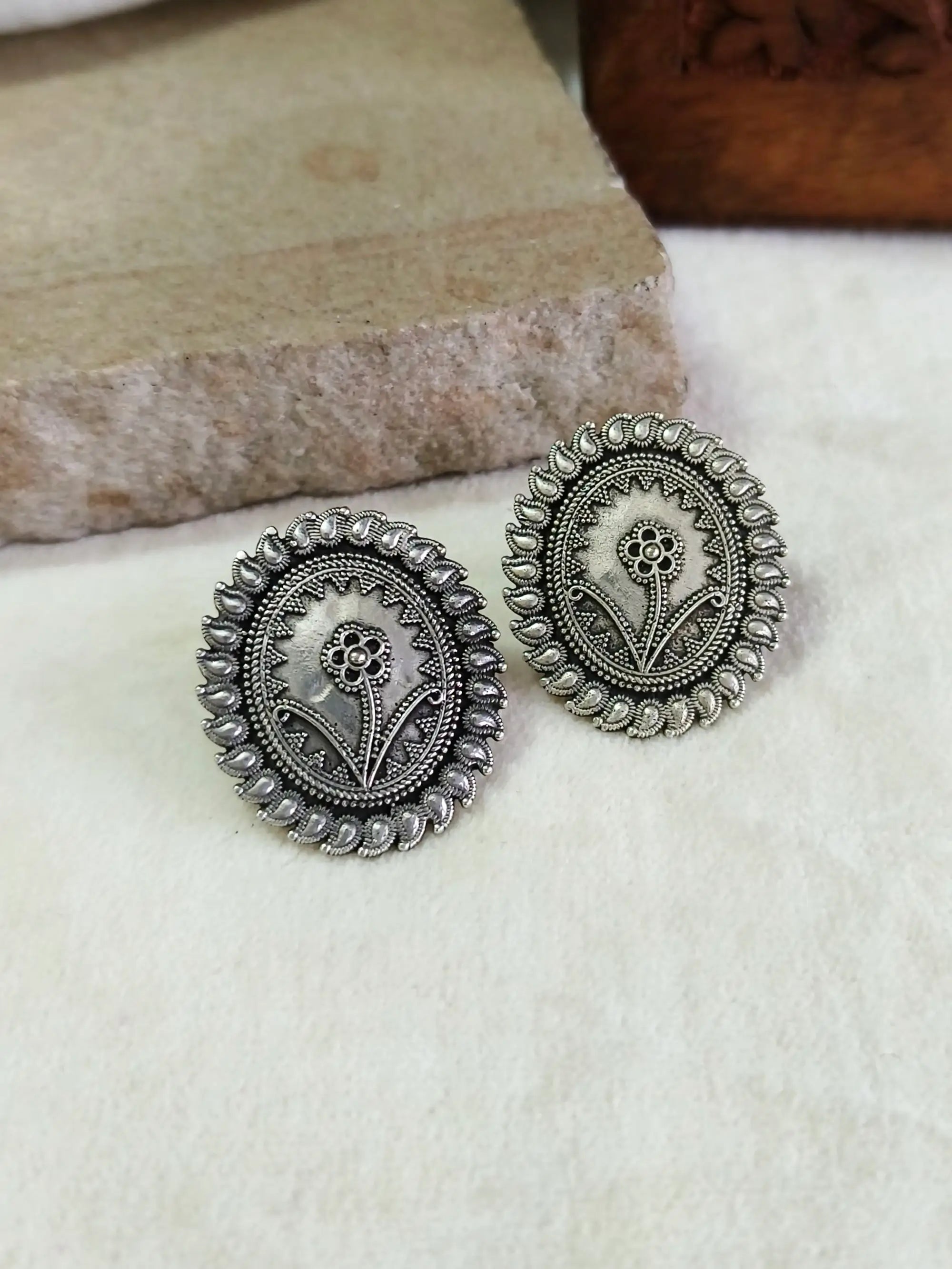 Add a touch of classic elegance to your look with these Traditional Oxidized Silver Flower Stud Earrings from Sarichka. Featuring a delicate floral design in a rich oxidized silver polish, these earrings blend timeless beauty with everyday wearability. Perfect for daily wear, office looks, festive gatherings, and casual outings, they are lightweight and comfortable for all-day use. Their versatile charm also makes them a thoughtful gift for loved ones.