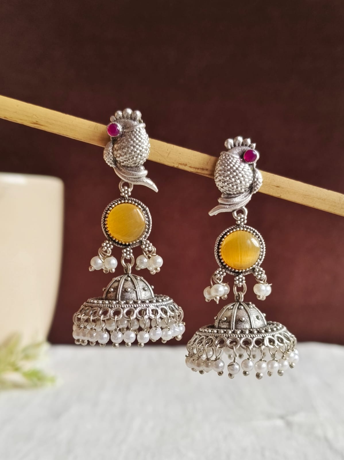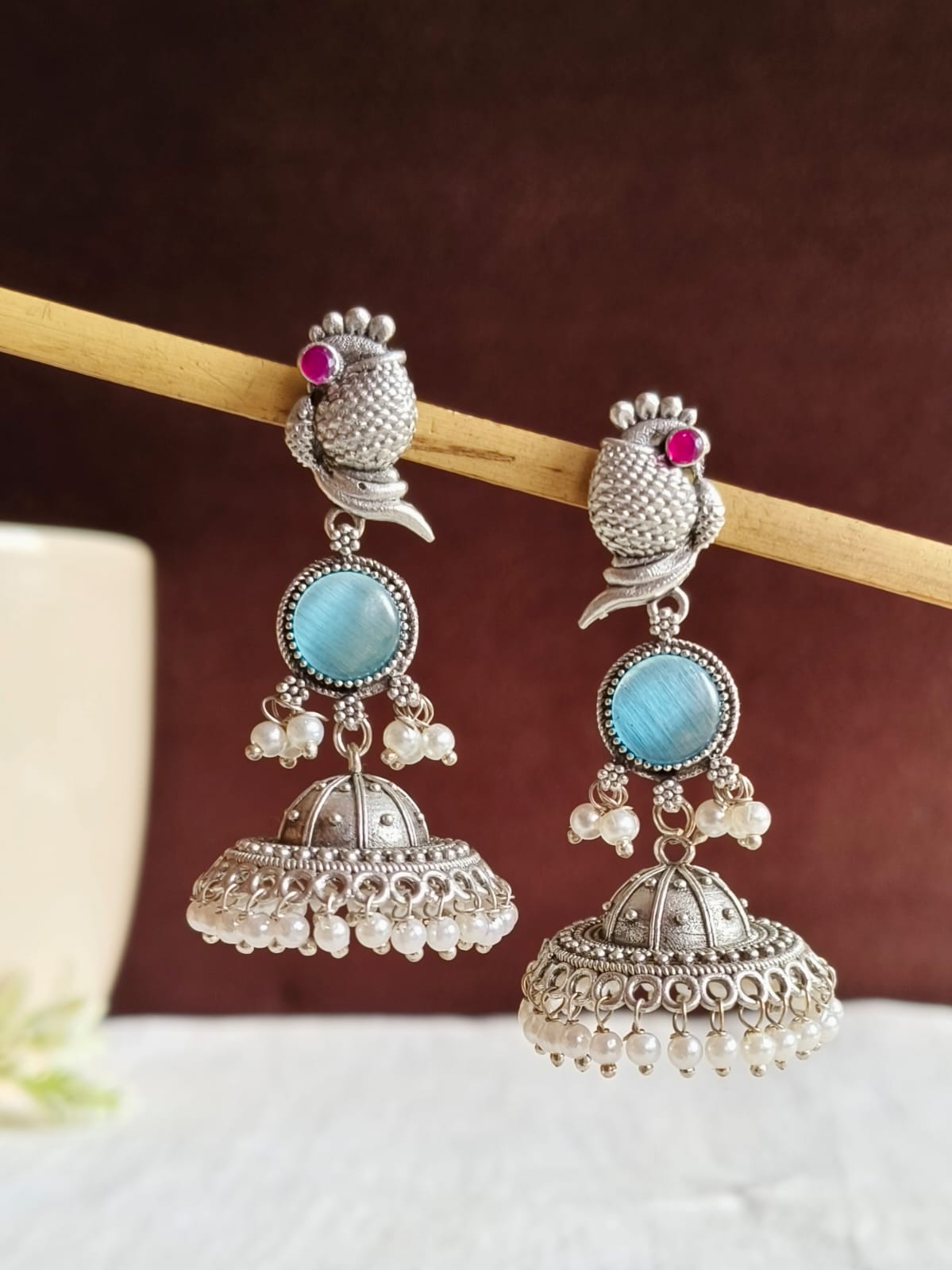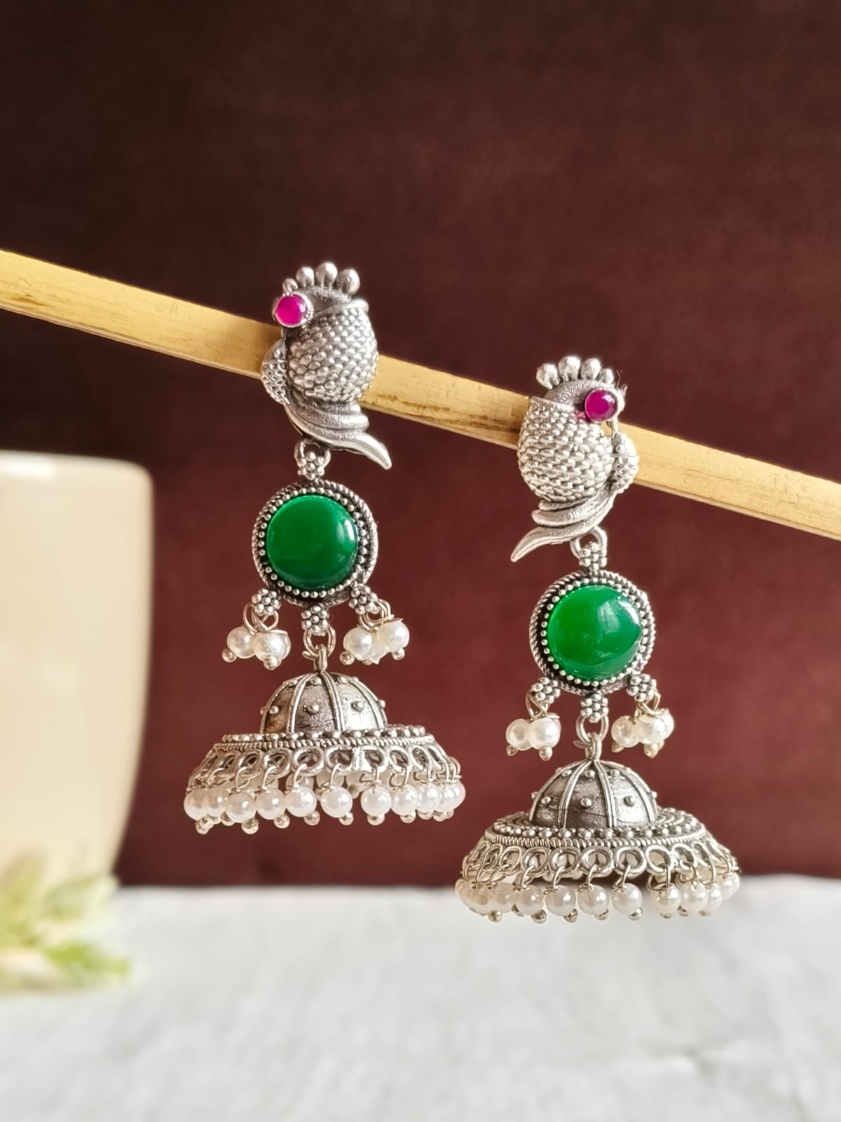 These stunning silver replica peacock jhumka earrings blend intricate detailing with timeless beauty, making them the perfect accessory for any grand occasion. The Monalisa stones and pearl drops elevate their elegance, ensuring you stand out.